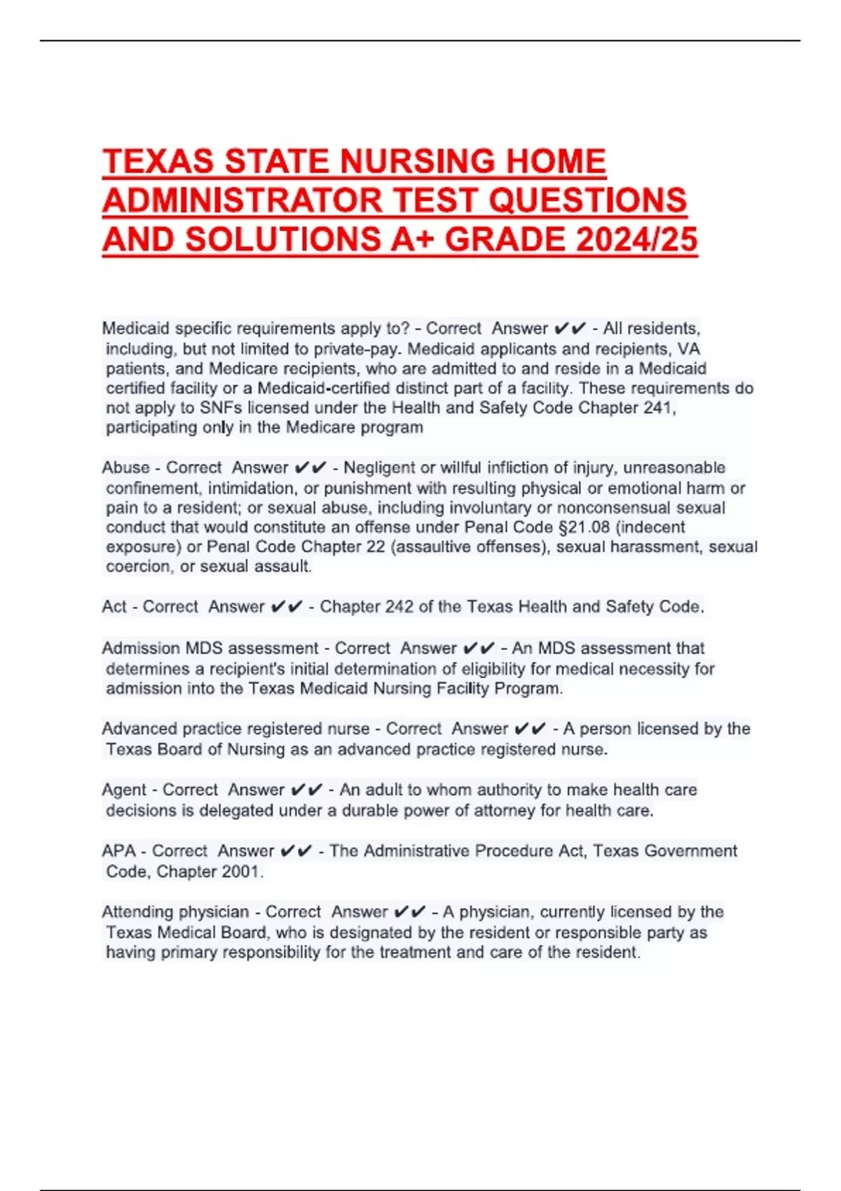 Texas State Nursing Home Administrator Test Questions and Solutions A+ Grade 2025