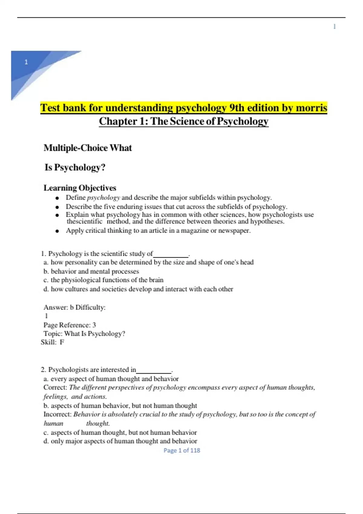 Test bank for understanding psychology 9th edition by morris Chapter 1:The Science of Psychology Multiple-Choice What Is Psychology? Learning Objectives ● Define psychology and describe the major subfields within psychology. ● Describe the five enduring issues that cut across the subfields of psychology. ● Explain what psychology has in common with other sciences, how psychologists use thescientific method, and the difference between theories and hypotheses. ● Apply critical thinking to an article in a magazine or newspaper. 1. Psychology is the scientific study of . a. how personality can be determined by the size and shape of one's head b. behavior and mental processes c. the physiological functions of the brain d. how cultures and societies develop and interact with each other Answer: b Difficulty: 1 Page Reference: 3 Topic: What Is Psychology? Skill: F 2. Psychologists are interested in . a. every aspect of human thought and behavior Correct: The different perspectives of psychology encompass every aspect of human thoughts, feelings, and actions. b. aspects of human behavior, but not human thought Incorrect: Behavior is absolutely crucial to the study of psychology, butso too is the concept of human thought. c. aspects of human thought, but not human behavior d. only major aspects of human thought and behavior 1 2 Page 2 of 118 Answer: a Difficulty: 1 Page Reference: 3 2 Topic: What Is Psychology? Skill: C 3. Psychology . a. rarely redefines itself, and when it does, it doesso more narrowly virtually never redefines itself Incorrect: The field of psychology is very introspective, making sure to redefine itself as often asis necessary. c. continually redefines itself more narrowly d. continually redefines itself more broadly Correct: New research methods, areas of inquiry, and collaborations with other sciences allowspsychology to continually redefine itself. Answer: d Difficulty: 2 Page Reference: 3 Topic: What Is Psychology? Skill: F 4. Psychology is . a. is a single, unified field of study Incorrect: There is no single, unifying definition of psychology; rather, it is a combination ofmany different areas of academic pursuit. b. is an "umbrella" for a loose amalgamation of different subfields Correct: The fact that there is no single unifying definition of psychology suggests that it is a combination of many sub-disciplines. c. is comprised of two distinct subfields d. not a field of study at all Answer: b Difficulty: 1 Page Reference: 3 Topic: What Is Psychology? Skill: C Test bank for understanding psychology 9th edition by morrisTest bank for understanding psychology 9th edition by morrisTest bank for understanding psychology 9th edition by morrisTest bank for understanding psychology 9th edition by morrisTest bank for understanding psychology 9th edition by morrisTest bank for understanding psychology 9th edition by morrisTest bank for understanding psychology 9th edition by morrisTest bank for understanding psychology 9th edition by morris