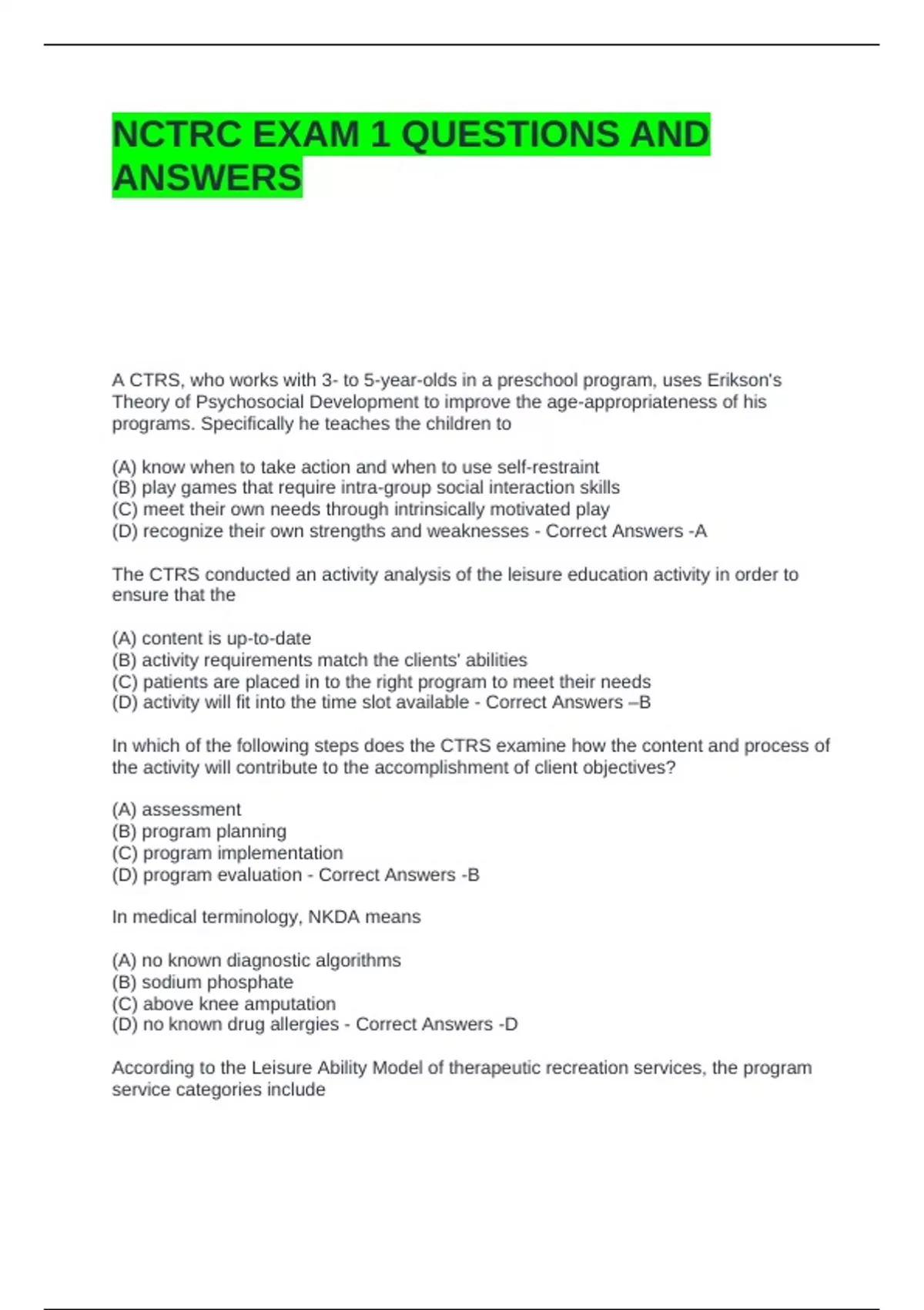 NCTRC EXAM 1 QUESTIONS AND