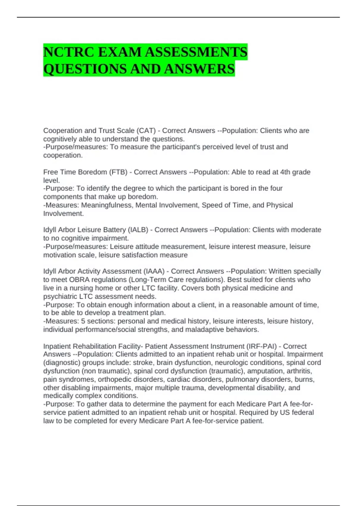 Leisurescope Plus - Correct Answers --Population: Adolescent and adults clients with