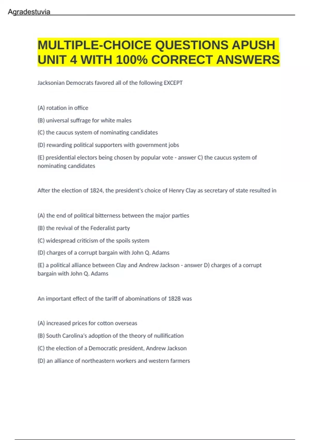 MULTIPLE-CHOICE QUESTIONS APUSH UNIT 4 WITH 100% CORRECT ANSWERSJacksonian Democrats favored all of the following EXCEPT (A) rotation in office (B) universal suffrage for white males (C) the caucus system of nominating candidates (D) rewarding political supporters with government jobs (E) presidential electors being chosen by popular vote - answer C) the caucus system of nominating candidates After the election of 1824, the president's choice of Henry Clay as secretary of state resulted in (A) the end of political bitterness between the major parties (B) the revival of the Federalist party (C) widespread criticism of the spoils system (D) charges of a corrupt bargain with John Q. Adams (E) a political alliance between Clay and Andrew Jackson - answer D) charges of a corrupt bargain with John Q. Adams An important effect of the tariff of abominations of 1828 was (A) increased prices for cotton overseas (B) South Carolina's adoption of the theory of nullification (C) the election of a Democratic president, Andrew Jackson (D) an alliance of northeastern workers and western farmers Agradestuvia (E) the growth of manufacturing in the South - answer B) South Carolina's adoption of the theory of nullification The Revolution of 1828 revealed that political power was (A) shifting to the western states (B) shifting to the southern states (C) entrenched on the eastern seaboard (D) gravitating toward conservative elements (E) evenly divided between Whigs and Democrats - answer A) shifting to the western states Which of the following documents would be most useful in evaluating President Jackson's commitment to democratic values? (A) the Specie Circular (B) veto message on the rechartering of the Second Bank of the United States (C) congressional hearings on the "corrupt bargain" (D) Supreme Court cases on the Indian-removal issue (E) Calhoun's writings on nullification - answer B) veto message on the recharging of the Second Bank of the United States In the 1830s, the factor that most directly promoted the development of a two-party system was (A) the growth of the immigrant population (B) increased interest in foreign affairs (C) changes in methods of nominating and electing the president (D) increasing sectional conflict between northern and southern stat