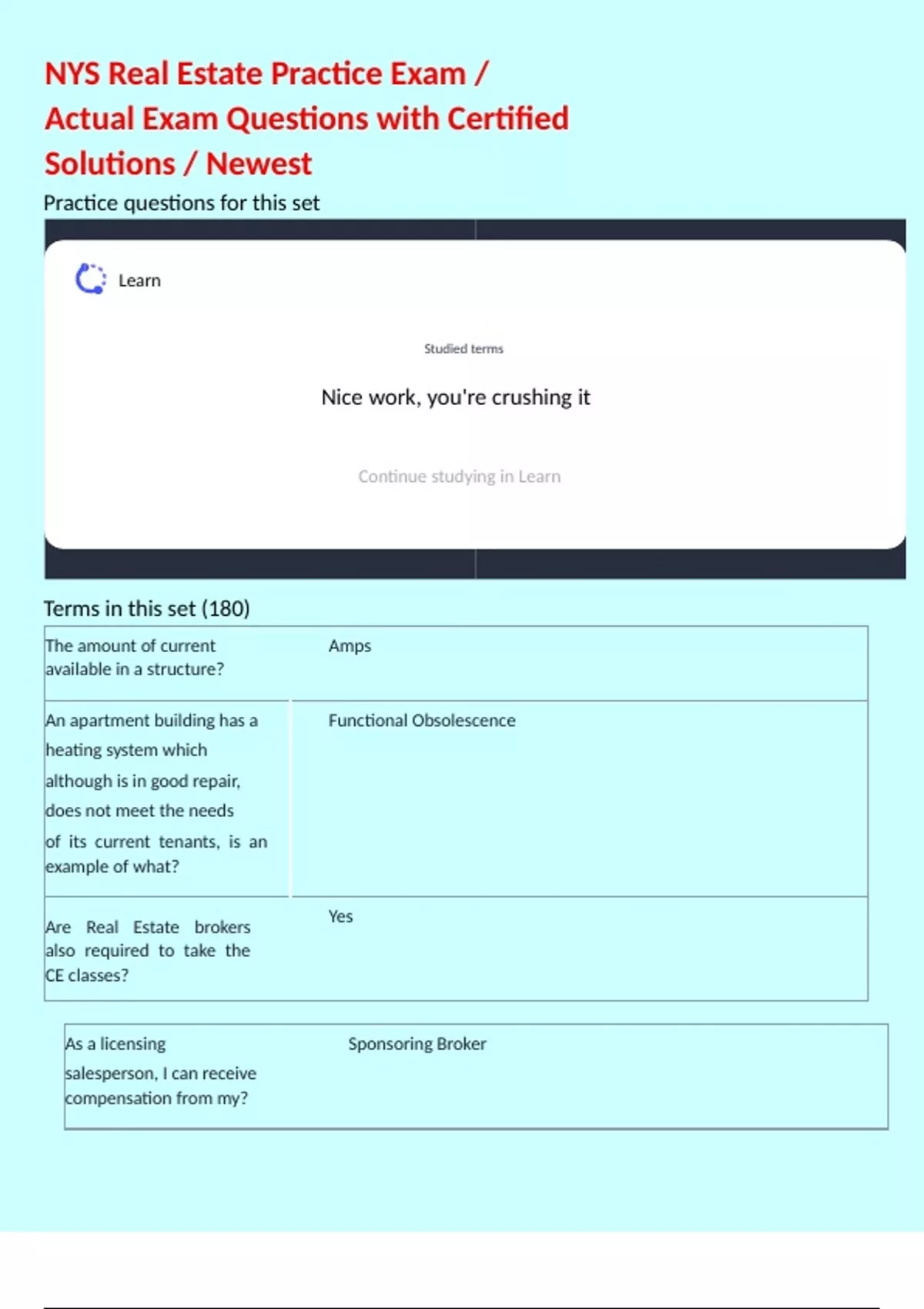 Terms in this set (180) The amount of current available in a structure? Amps An apartment building has a heating system which although is in good repair, does not meet the needs of its current tenants, is an example of what? Functional Obsolescence Are Real Estate brokers also required to take the CE classes? Yes As a licensing salesperson, I can receive compensation from my? Sponsoring Broker As an estate planner, I am what kind of agent? Universal Agent