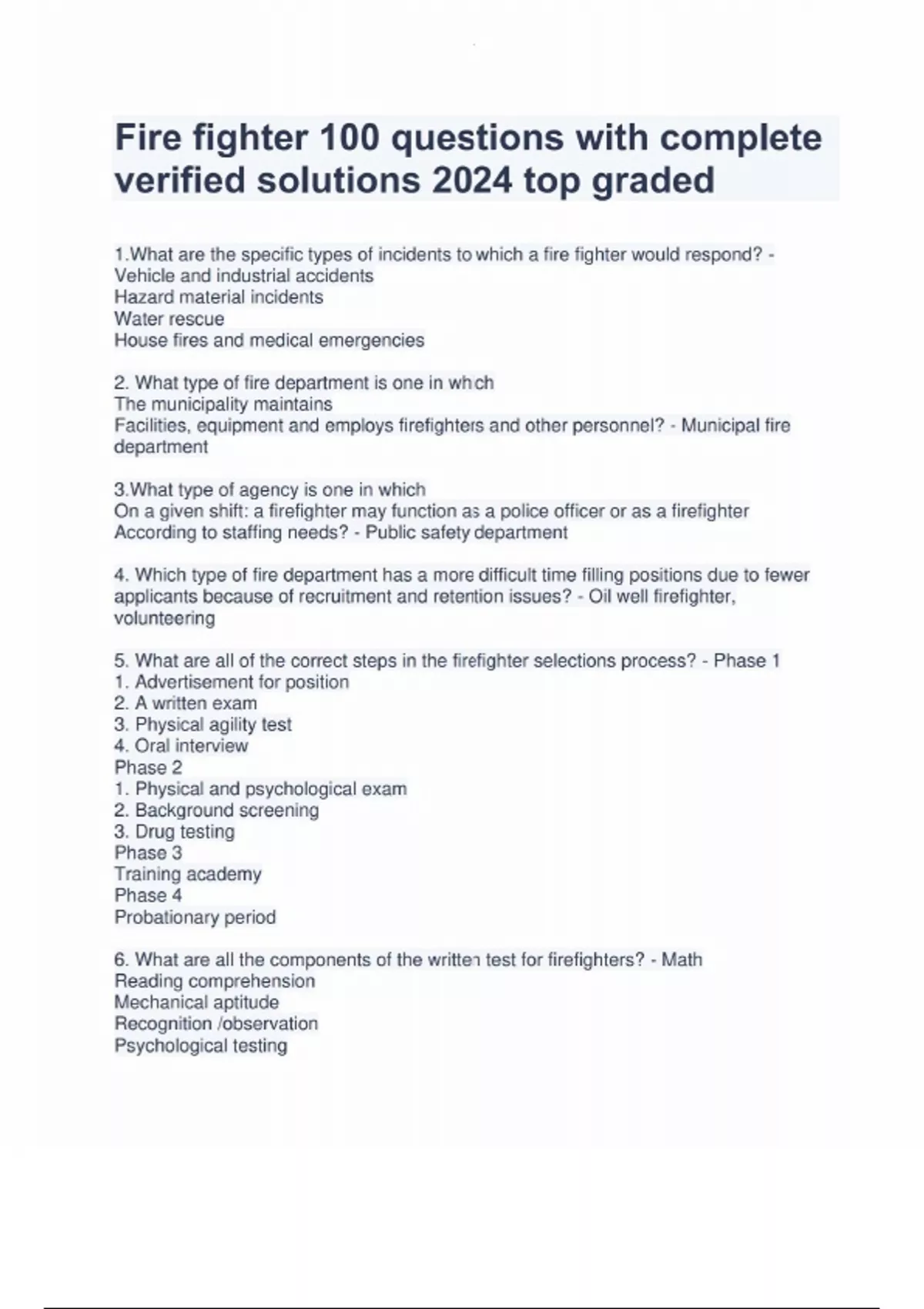 This resource features 100 firefighter exam questions with complete, verified solutions for 2024. Designed to provide in-depth preparation, it covers a wide range of firefighting concepts, ensuring top-tier performance on your certification exams.