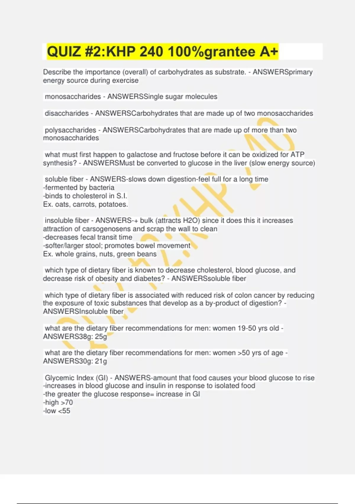 QUIZ #2:KHP 240 100%grantee A+ Describe the importance (overall) of carbohydrates as substrate. - ANSWERSprimary energy source during exercise monosaccharides - ANSWERSSingle sugar molecules disaccharides - ANSWERSCarbohydrates that are made up of two monosaccharides polysaccharides - ANSWERSCarbohydrates that are made up of more than two monosaccharides what must first happen to galactose and fructose before it can be oxidized for ATP synthesis? - ANSWERSMust be converted to glucose in the liver (slow energy source) soluble fiber - ANSWERS-slows down digestion-feel full for a long time -fermented by bacteria -binds to cholesterol in S.I. Ex. oats, carrots, potatoes. insoluble fiber - ANSWERS-+ bulk (attracts H2O) since it does this it increases attraction of carsogenosens and scrap the wall to clean -decreases fecal transit time -softer/larger stool; promotes bowel movement Ex. whole grains, nuts, green beans which type of dietary fiber is known to decrease cholesterol, blood glucose, and decrease risk of obesity and diabetes? - ANSWERSsoluble fiber which type of dietary fiber is associated with reduced risk of colon cancer by reducing the exposure of toxic substances that develop as a by-product of digestion? - ANSWERSInsoluble fiber what are the dietary fiber recommendations for men: women 19-50 yrs old - ANSWERS38g: 25g what are the dietary fiber recommendations for men: women 50 yrs of age - ANSWERS30g: 21g Glycemic Index (GI) - ANSWERS-amount that food causes your blood glucose to rise -increases in blood glucose and insulin in response to isolated food -the greater the glucose response= increase in GI -high 70 -low 55 Glycemic Load (GL) - ANSWERS-takes into account amount of CHO consumed -may not truly reflect glycemic effect of food (We don't eat foods in isolation) -GL=(GI x CHO content g/serving) /100 -high or = 20 -medium 11-19 -low or = 10 what is gluten - ANSWERSstructural protein naturally found in certain cereal grains. often refers to wheat protein, in medical literature refers to combination of prolamin and glutelin proteins naturally occurring in all grains what is celiac disease and what effect does it have on nutrient absorption? - ANSWERSan autoimmune disorder of the S.I. Caused by rxn to gluten, when eaten the body produces an inflammatory rxn which truncates (shortens) the villi of the S.I. therefore, impairing nutrient absorption why wouldn't AMDR for CHO (45-65%) be sufficient for endurance athletes? - ANSWERSbecause they wouldn't be able to produce the proper amount of glycogen that is needed during high intensity long duration X time trial - ANSWERSwhich times how long it takes for someone to complete a set task work - ANSWERShow much work can someone do in a set period time exhaustion - ANSWERShow long someone can sustain work at a given workload before fatigue Aerobic capacity (VO2 max) - ANSWERSmaximal O2 consumption; maximum amount of O2 used per minute/kg BW Anaerobic threshold - ANSWERSat what intensity does someone start using glycolysis for energy production about how long would an athlete's muscle glycogen sustain exercise at 120% of their VO2 max - ANSWERSless than 20 mins describe what happens to liver glucose output with increasing X intensity - ANSWERSIncreases only with prolonged X would liver glucose output decrease. This is due to increased glucose utilization by the muscle Why does liver glucose output increase with X intensity - ANSWERSIn order to keep up with increasing glucose utilization by the exercising muscle, and to maintain blood glucose concentrations, the liver will increase glucose output. where are the body's glucose depots - ANSWERSliver and skeletal muscle what are the fates of glucose once it has entered a muscle cell - ANSWERScan be oxidized for ATP synthesis or stored as glycogen once it enters the muscle cells. Glucose becomes trapped and cannot leave the cell what are the fates of glucose once it has entered a liver cell - ANSWERSit gets converted into glycogen and then stored as fat in adipose tissue, or be stored as liver glycogen, or released through the blood to be sent to other tissues, it can leave the cell after being converted back into glucose what is gluconeogenesis - ANSWERSthe making of glucose Where does gluconeogenesis occur - ANSWERSliver insulin promotes - ANSWERShepatic glucose uptake and stimulates glycogen synthesis insulin inhibits - ANSWERSglucogenesis glucagon promotes - ANSWERSglycogenesis, stimulates liver glycogenolysis and release of glucose glucagon inhibits - ANSWERSglycolysis catecholamines; epinephrine; norepinephrine promotes - ANSWERSglucogenesis, stimulates liver glycogenolysis and release of glucose catecholamines; epinephrine; norepinephrine inhibits - ANSWERSprevents release of insulin what situation stimulate gluconeogenesis - ANSWERSincreased exercise duration and intensity what situation inhibit glyconeogenesis - ANSWERSafter CHO consumption explain effects of insulin on blood glucose concentration and glycogen concentration - ANSWERSused to keep the blood glucose from getting too high. therefor it promotes transportation of blood glucose into hepatocytes where it's converted to glycogen which would increase concentration of glycogen explain effects of glucagon on blood glucose concentration and glycogen concentration - ANSWERSprimary role is to keep from allowing blood glucose levels to drop too low. Stimulate the conversion of stored glycogen to glucose, which can be released into bloodstream which decreased concentration of glycogen. how does insulin exert its effects - ANSWERSpromotes tissue uptake of glucose