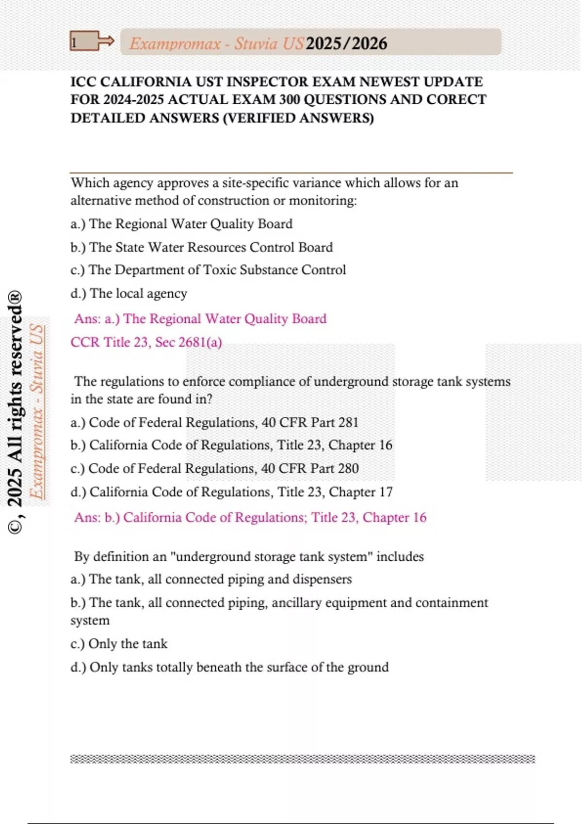 ICC CALIFORNIA UST INSPECTOR EXAM NEWEST UPDATE FOR ACTUAL EXAM 300 QUESTIONS AND CORECT DETAILED ANSWERS (VERIFIED ANSWERS)