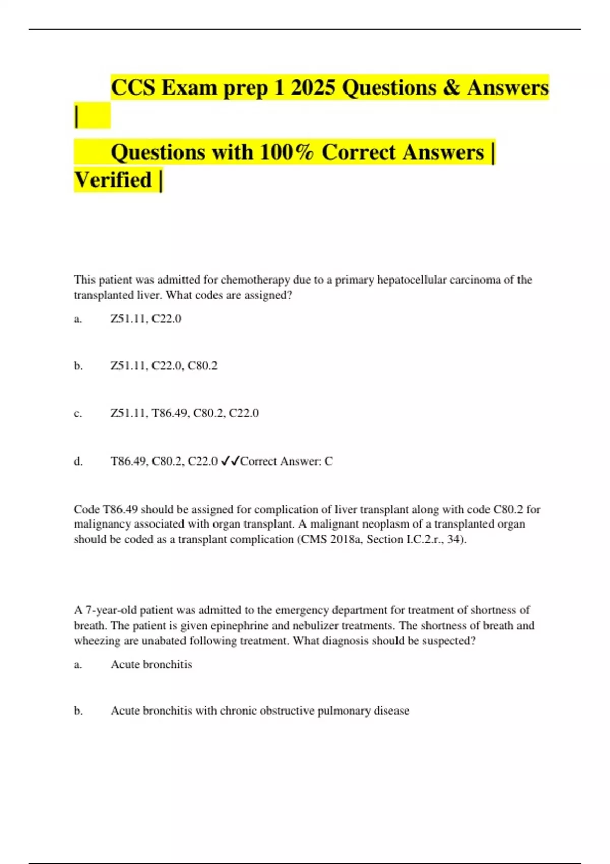 CCS Exam prep 1 2025 Questions & Answers | Questions with 100% Correct Answers | Verified This patient was admitted for chemotherapy due to a primary hepatocellular carcinoma of the transplanted liver. What codes are assigned? a. Z51.11, C22.0 b. Z51.11, C22.0, C80.2 c. Z51.11, T86.49, C80.2, C22.0 d. T86.49, C80.2, C22.0 Correct Answer: C Code T86.49 should be assigned for complication of liver transplant along with code C80.2 for malignancy associated with organ transplant. A malignant neoplasm of a transplanted organ should be coded as a transplant complication (CMS 2018a, Section I.C.2.r., 34). A 7-year-old patient was admitted to the emergency department for treatment of shortness of breath. The patient is given epinephrine and nebulizer treatments. The shortness of breath and wheezing are unabated following treatment. What diagnosis should be suspected? a. Acute bronchitis b. Acute bronchitis with chronic obstructive pulmonary disease c. Asthma with status asthmaticus d. Chronic obstructive asthma Correct Answer: C "Status asthmaticus is an acute asthmatic attack in which the degree of bronchial obstruction is not relieved by the usual treatment, such as by epinephrine or aminophylline" (Schraffenberger and Palkie 2018, 346-347). . A patient is admitted with a high temperature, lethargy, hypotension, tachycardia, oliguria, and elevated WBC. The patient also has more than 100,000 organisms of Escherichia coli per cc of urine. The attending physician documents "urosepsis." What is the next step for the coder? a. Code sepsis as the principal with a secondary diagnosis of urinary tract infection due to E. coli. b. Code urinary tract infection with sepsis as a secondary diagnosis. c. Query the physician to determine if the patient is being treated for sepsis, highlighting the clinical signs and symptoms. d. Ask the physician whether the patient had septic shock so that this may be used as the principal diagnosis. Correct Answer: C The term urosepsis is a nonspecific term. It has no default code in the Alphabetic Index. Should providers use this term, they must be queried for clarification (CMS 2018a, Section I.C.1.d., 22). During a coronary artery bypass surgery, the patient underwent saphenous bypass grafts; from the aorta to the left anterior descending branch of the left main coronary artery, and the left posterior descending of the left main coronary artery. The patient also underwent a repositioning of the mammary artery to the right coronary artery. Choose the best description for this procedure. a. Three aortocoronary grafts b. Two aortocoronary grafts and one mammary-coronary graft c. Two aortocoronary grafts and two saphenous bypass grafts d. Three aortocoronary grafts and one mammary-coronary graft Correct Answer: B It is rare for only one coronary artery to be bypassed, and it is also fairly common to perform both an internal mammary-coronary artery bypass and an aortocoronary bypass at the same operative episode (Schraffenberger and Palkie 2018, 324-326). According to CPT, an endoscopy that is undertaken to the level of the midtransverse colon would be coded as a: a. Proctosigmoidoscopy b. Sigmoidoscopy c. Colonoscopy d. Proctoscopy orrect Answer: C A colonoscopy is an examination of the entire colon, from the rectum to the cecum that may include the terminal ileum. In general, a colonoscopy examines the colon to a level of 60 cm or higher (Smith 2018, 135-136). Infusion of Herceptin, a monoclonal antibody used for treatment of breast cancer in patients carrying a certain mutation of the HER2 gene, is classified as: a. Chemotherapy b. Radiotherapy c. Molecular Targets d. Immunotherapy Correct Answer: C Targeted cancer therapies are drugs or other substances that block the growth and spread of cancer by interfering with specific molecules involved in tumor growth and progression. Herceptin is a type of targeted cancer therapy also referred to as a monoclonal antibody (National Cancer Institute 2018). A patient has findings suggestive of chronic obstructive pulmonary disease (COPD) on chest xray. The attending physician mentions the x-ray finding in one progress note but no medication, treatment, or further evaluation is provided. The coder should: a. Query the attending physician regarding the x-ray finding b. Code the condition because the documentation reflects it