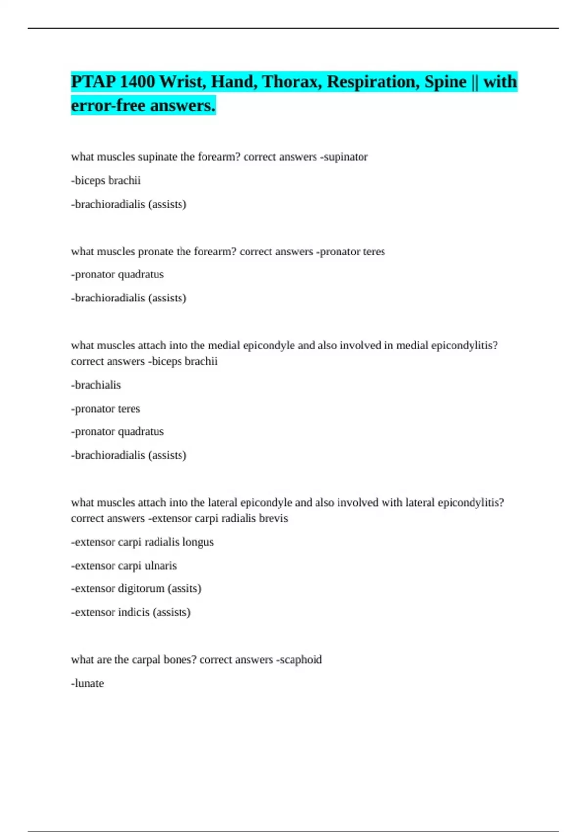 PTAP 1400 Wrist, Hand, Thorax, Respiration, Spine || with error-free answers.