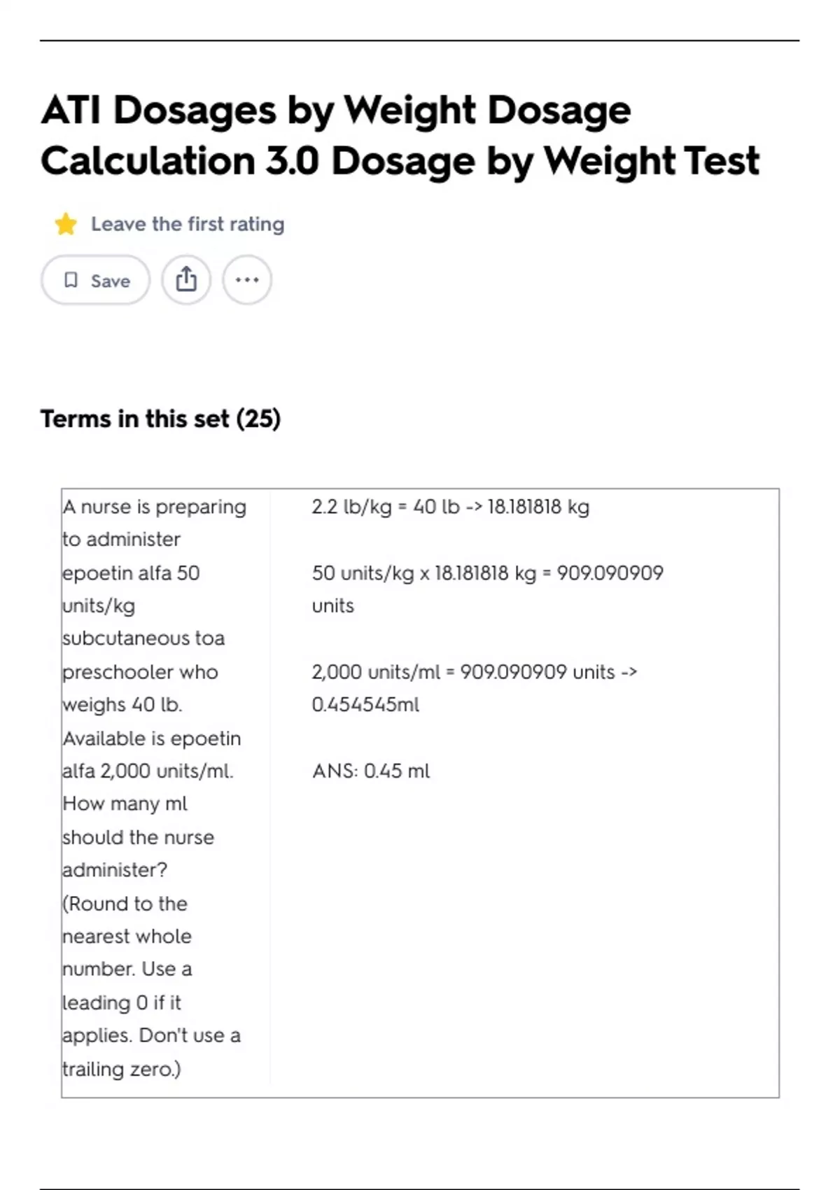 A nurse is preparing 2.2 lb/kg = 40 lb -> 18.181818 kg