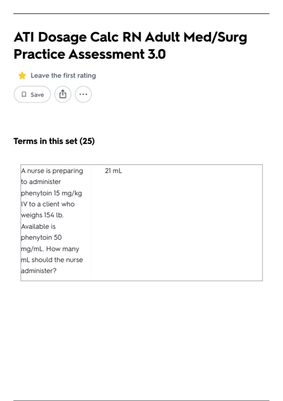 ATI Dosage Calc RN Adult Med/Surg Practice Assessment 3.0 Leave the first rating Save Terms in this set (25) A nurse is preparing to administer phenytoin 15 mg/kg IV to a client who weighs 154 lb. Available is phenytoin 50 mg/mL. How many mL should the nurse administer? 21 mL A nurse is preparing to administer methadone 0.1 mg/kg IV bolus to a client who weighs 104 lb. Available is methadone 10 mg/mL. How many mL should the nurse administer? 0.47 mL A nurse is preparing to administer methylprednisolone acetate 0.05 g IM. Available is methyprednisolone acetate injection 80 mg/mL. How many mL should the nurse administer? 0.63 mL A nurse is preparing to administer 0.9% sodium chloride (0.9% NaCl) 1,000 mL IV to infuse at 125 mL/hr. The drop factor of the manual IV tubing is 15 gtt/mL. The nurse should set the manual IV infusion to diliver how many gtt/min? 31 gtt/min
