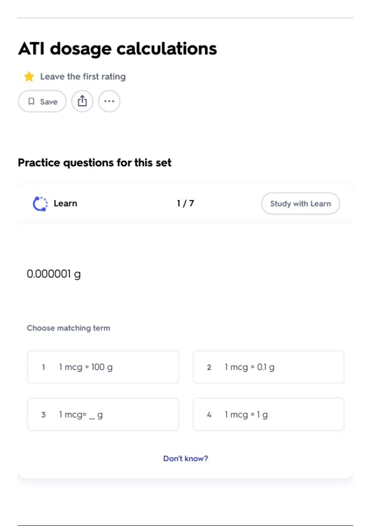ATI dosage calculations Leave the first rating Save Practice questions for this set Learn 0.000001 g Choose matching term 1 1 mcg = 100 g 1 / 7 Study with Learn 2 1 mcg = 0.1 g 3 1 mcg= __ g 4 1 mcg = 1 g Don't know? Terms in this set (23) grams g and kg measures weight; g, mg, and mcg measures the dosage of medications liters mL and L measures volume meters mm, cm, and m measures length 1 kg = __ g 1000 g 1 g = __mg 1000 mg 1 g = __ mcg 1,000,000 mcg 1 g =__ kg 0.001 kg 1 mg = __g 0.001 g