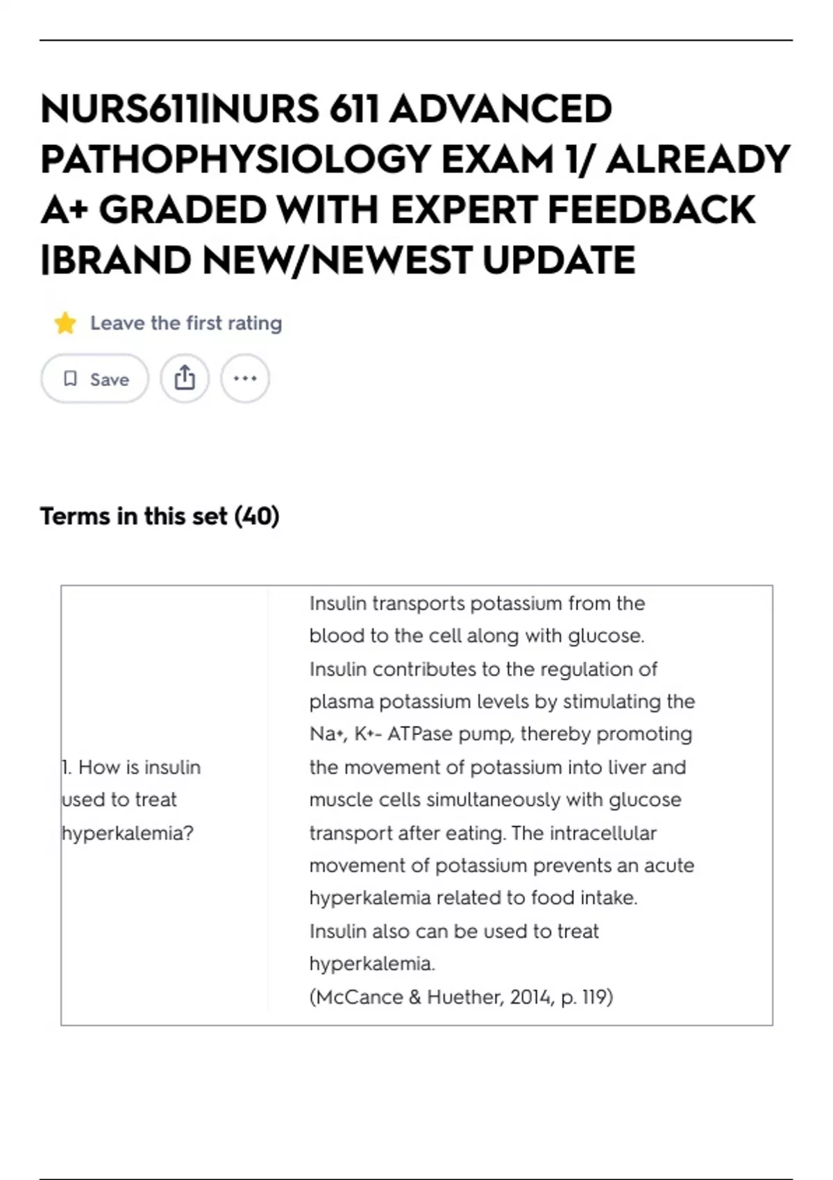 NURS611|NURS 611 ADVANCED PATHOPHYSIOLOGY EXAM 1/ ALREADY A+ GRADED WITH EXPERT FEEDBACK |BRAND NEW/NEWEST UPDATE Leave the first rating Save Terms in this set (40) 1. How is insulin used to treat hyperkalemia? Insulin transports potassium from the blood to the cell along with glucose. Insulin contributes to the regulation of plasma potassium levels by stimulating the Na+, K+- ATPase pump, thereby promoting the movement of potassium into liver and muscle cells simultaneously with glucose transport after eating. The intracellular movement of potassium prevents an acute hyperkalemia related to food intake. Insulin also can be used to treat hyperkalemia. (McCance & Huether, 2014, p. 119) 2. Hyperaldosteronis m causes which fluid and electrolyte imbalances? 3. What mechanisms cause hypernatremia? Hypokalemia, hypernatremia, and fluid volume excess. Hyperaldosteronism promotes (1) increased renal sodium and water reabsorption with corresponding hypervolemia and hypertension and (2) renal excretion of potassium. (McCance & Huether, 2014, p. 755) • Inadequate intake of free water associated with total body sodium depletion. • Excessive losses of water from the urinary tract that leads to a combination of sodium and free water losses. • Water losses associated with extreme sweating. • Severe watery diarrhea • Excessive excretion of water from the kidneys or impaired responsiveness of the kidneys to vasopressin. 1. Excessive hypertonic salt solutions 2. Intravenous hypertonic sodium 3. Saline - induced abortions 4. Selected infant formulas 5. Hyperaldosteronism 6. Cushing Syndrome (McCance & Huether, 2014, Table 3-7, p. 111)