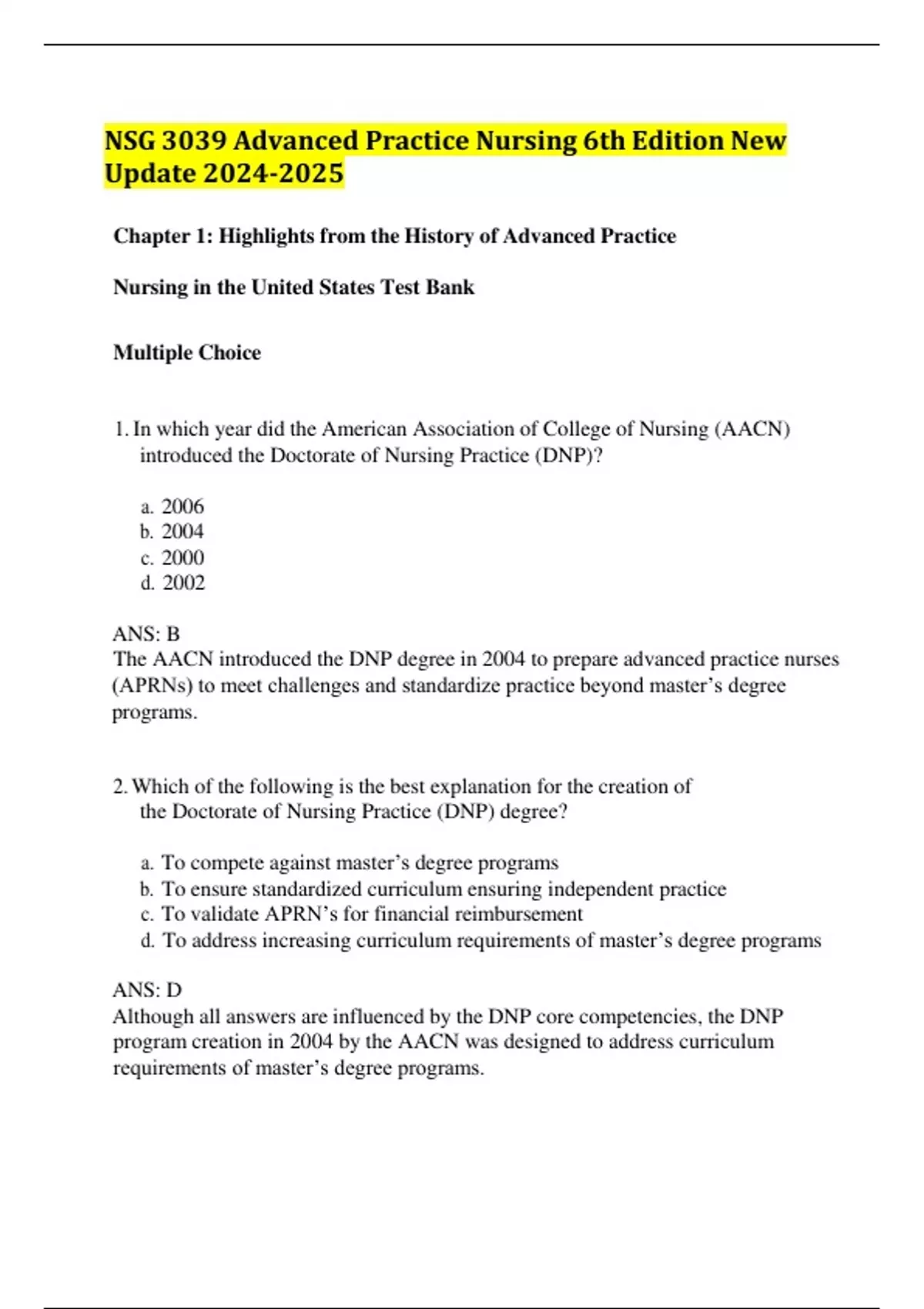 NSG 3039 Advanced Practice Nursing 6th Edition New Update Chapter 1: Highlights from the History of Advanced Practice Nursing in the United States Test Bank Multiple Choice 1. In which year did the American Association of College of Nursing (AACN) introduced the Doctorate of Nursing Practice (DNP)? a. 2006 b. 2004 c. 2000 d. 2002 ANS: B The AACN introduced the DNP degree in 2004 to prepare advanced practice nurses (APRNs) to meet challenges and standardize practice beyond master’s degree programs. 2.Which of the following is the best explanation for the creation of the Doctorate of Nursing Practice (DNP) degree? a. To compete against master’s degree programs b. To ensure standardized curriculum ensuring independent practice c. To validate APRN’s for financial reimbursement d. To address increasing curriculum requirements of master’s degree programs ANS: D Although all answers are influenced by the DNP core competencies, the DNP program creation in 2004 by the AACN was designed to address curriculum requirements of master’s degree programs. 3. Which of the following was the first recognized area of advanced practice nursing? a. Clinical Nurse Specialist b. Family nurse practitioner c. Pediatric nurse practitioner d. Certified Registered Nurse Anesthetist ANS: D In 1931, the National Association of Nurse Anesthetists (NANA), renamed in 1939 to the American Association of Nurse Anesthetists (AANA) was the first recognized group promoting advanced nursing practice. Agatha Hodgins founded the AANM at Lakeside Hospital in Cleveland, Ohio. 4. Which factor is broadly perceived to solidify and standardize the role of the APNs over the last 25 years? a. Lack of access to health care providers b. Standardized curriculum development c. Payment for services d. Societal forces ANS: B As the evolution of Advanced Practice Nursing advances specific specialties and needs are identified. Through the evolution of organization and standardization these roles have solidified the APN’s role in today’s health care environment. 5. During the formation of early APN roles in anesthesia, which of the following increased demand for access to health care? a. Poverty b. War c. Rural access to care d.Availability of training ANS: B Earliest demand for nursing-provided anesthesia spiked during periods of war when numbers of physicians were inadequate. The earliest records date back to the American Civil War with the administration of chloroform. During World War I in 1917 more than 1000 nurses, some trained anesthetists, traveled into battle. Other factors such as need for rural health care came later in the validation and need for APNs. 6. In 1889, Dr. William Worrall Mayo built and opened St. Mary’s hospital in Rochester, NY. He is known for some of the earliest recruitment and specialized training of nurses in which of the following roles? a. Pediatrics b.Anesthesia c. Obstetrics d. Research and statistics e. Family nursing ANS: B NSG 3039 Advanced Practice Nursing 6th Edition New Update NSG 3039 Advanced Practice Nursing 6th Edition New Update NSG 3039 Advanced Practice Nursing 6th Edition New Update NSG 3039 Advanced Practice Nursing 6th Edition New Update NSG 3039 Advanced Practice Nursing 6th Edition New Update