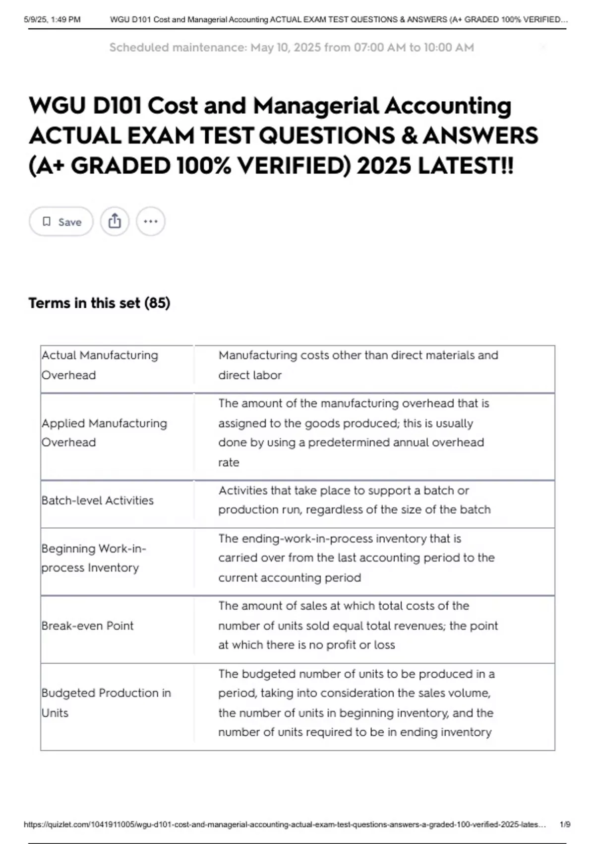 , 5/9/25, 1:49 PM WGU D101 Cost and Managerial Accounting ACTUAL EXAM TEST QUESTIONS & ANSWERS (A+ GRADED 100% VERIFIED…