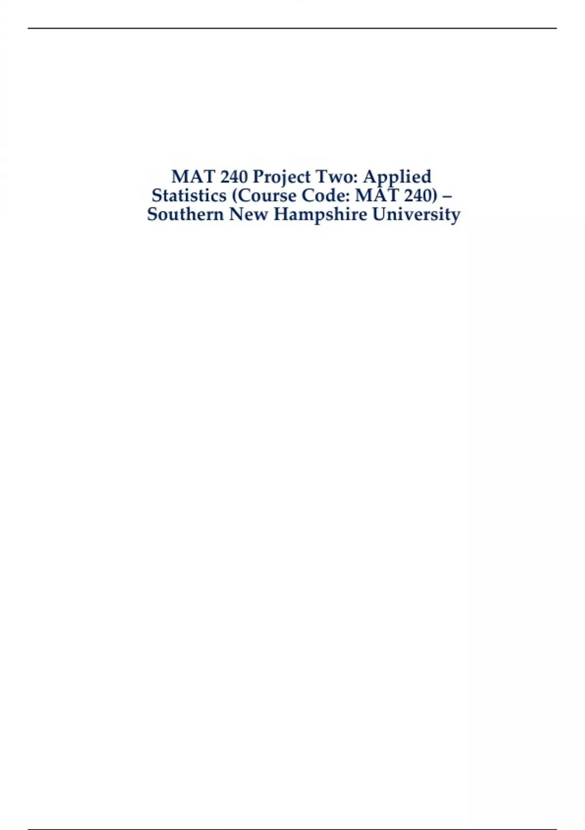 This Project Two study guide is tailored for students enrolled in MAT 240: Applied Statistics at Southern New Hampshire University. It covers key statistical methods and techniques used to analyze data, including hypothesis testing, regression analysis, and probability theory. The guide includes step-by-step solutions to common statistical problems, helping students understand the application of these methods to real-world scenarios. Designed to assist in preparing for exams, assignments, and projects, this resource provides a clear understanding of how to apply statistical concepts in practical contexts.