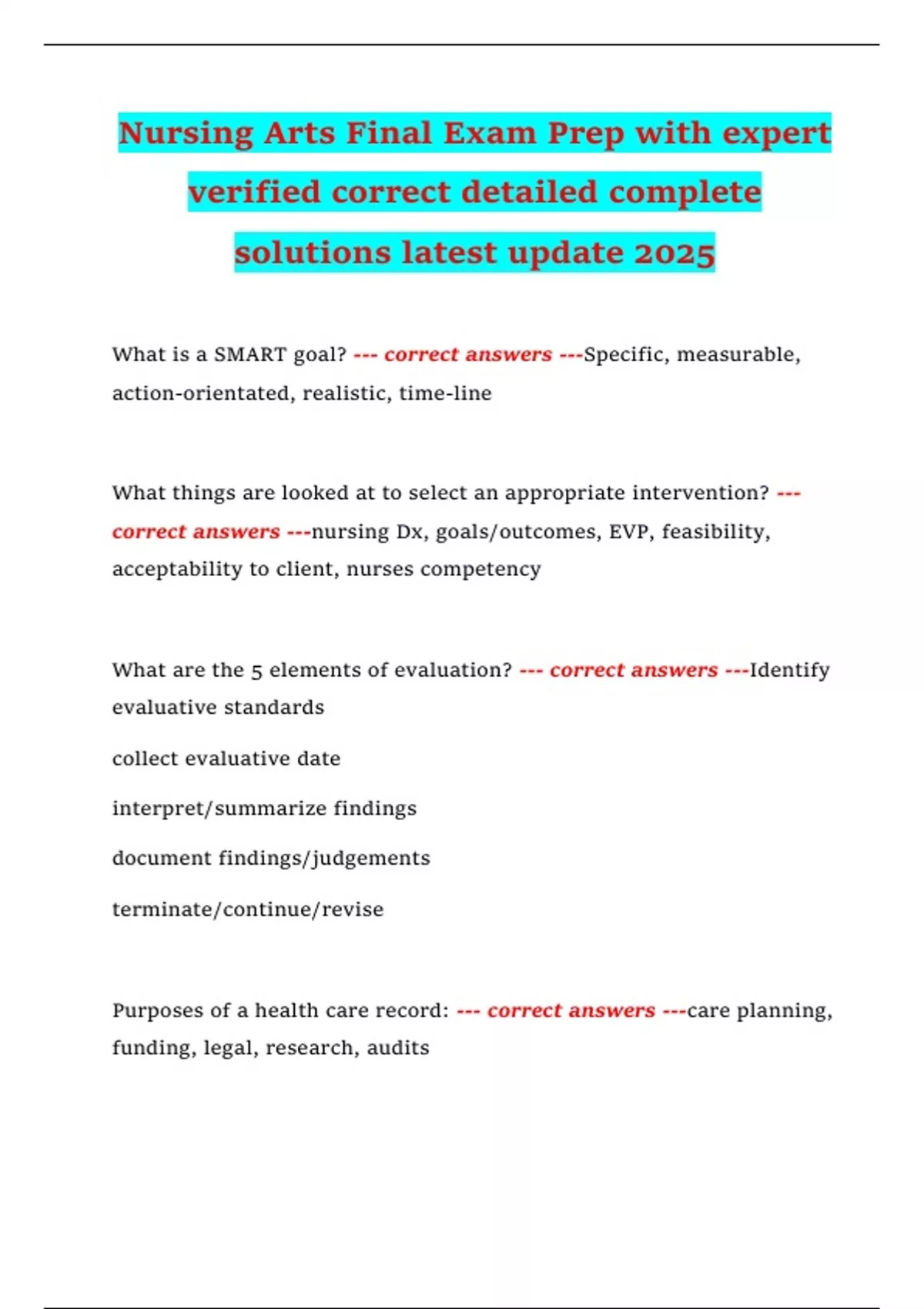 correct answers ---nursing Dx, goals/outcomes, EVP, feasibility,