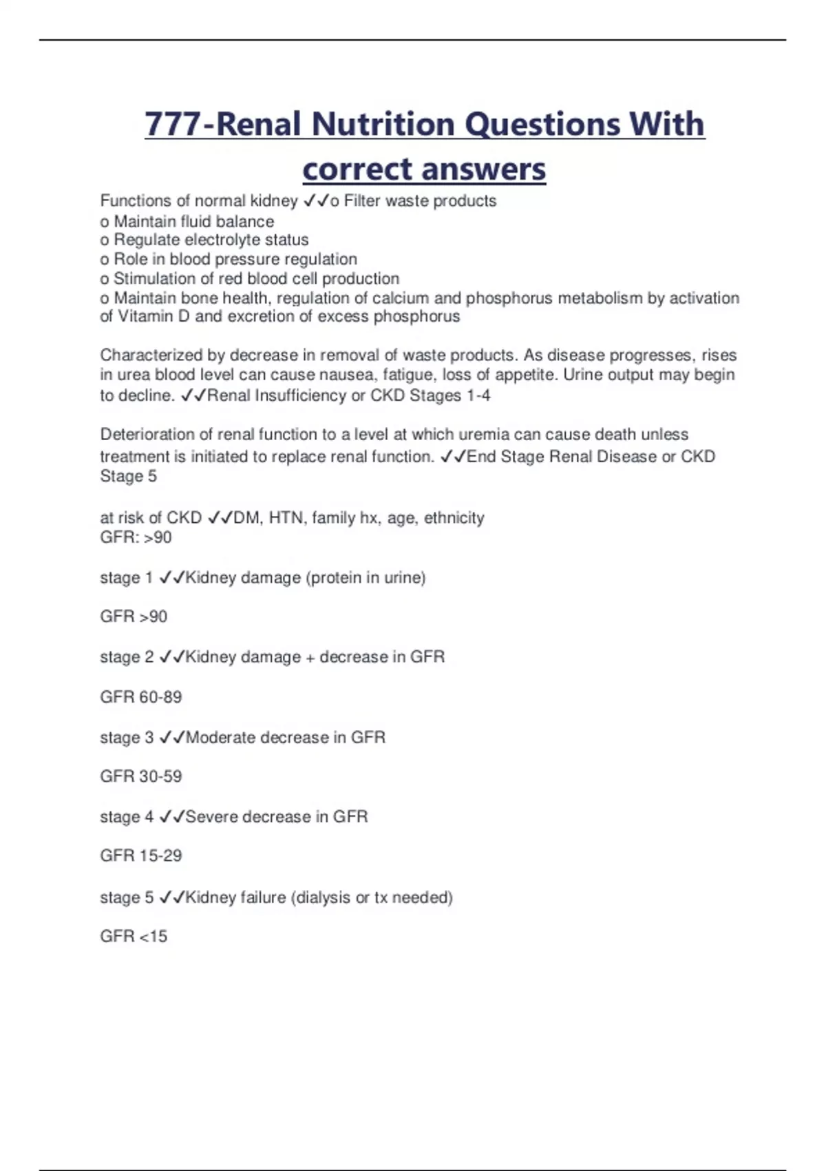 777-Renal Nutrition Questions With correct answers Functions of normal kidney o Filter waste products o Maintain fluid balance o Regulate electrolyte status o Role in blood pressure regulation o Stimulation of red blood cell production o Maintain bone health, regulation of calcium and phosphorus metabolism by activation of Vitamin D and excretion of excess phosphorus Characterized by decrease in removal of waste products. As disease progresses, rises in urea blood level can cause nausea, fatigue, loss of appetite. Urine output may begin to decline. Renal Insufficiency or CKD Stages 1-4 Deterioration of renal function to a level at which uremia can cause death unless treatment is initiated to replace renal function. End Stage Renal Disease or CKD Stage 5