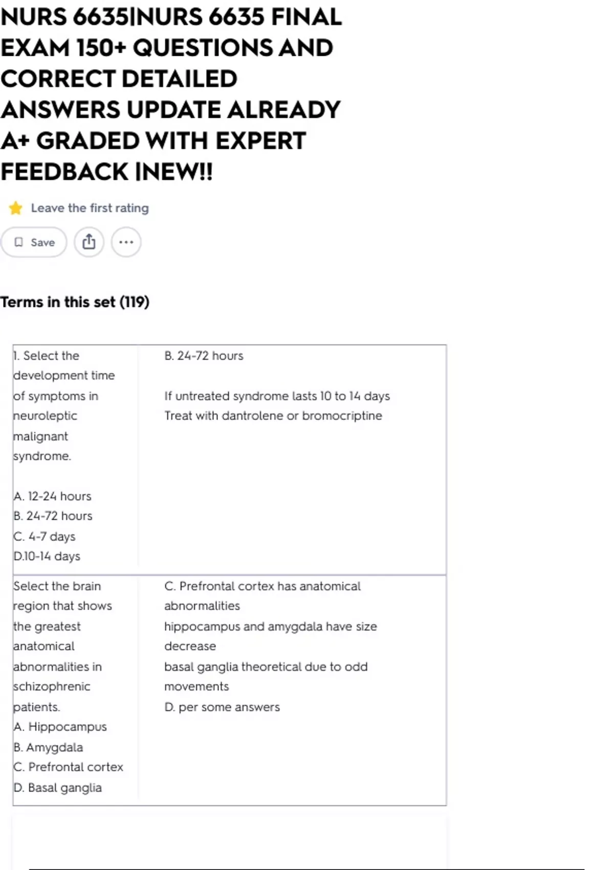 NURS 6635|NURS 6635 FINAL EXAM 150+ QUESTIONS AND CORRECT DETAILED ANSWERS UPDATE ALREADY A+ GRADED WITH EXPERT FEEDBACK |NEW!! Leave the first rating Save Terms in this set (119) 1. Select the development time of symptoms in neuroleptic malignant syndrome. A. 12-24 hours B. 24-72 hours C. 4-7 days D.10-14 days B. 24-72 hours If untreated syndrome lasts 10 to 14 days Treat with dantrolene or bromocriptine Select the brain region that shows the greatest anatomical abnormalities in schizophrenic patients. A. Hippocampus B. Amygdala C. Prefrontal cortex D. Basal ganglia C. Prefrontal cortex has anatomical abnormalities hippocampus and amygdala have size decrease basal ganglia theoretical due to odd movements D. per some answers Select the mental function that is most affected in mild cognitive impairment. A. General cognition B. Activities of daily living C. Geographic orientation D. Recent memory D. Recent memory Select the time frame for symptoms of schizophreniform disorder. A. 2 to 6 weeks B. 1 to 5 months C. 6 to 8 months D. 1 year Symptoms are short term lasting at least 1 month but less than 6 months. p. 342 Select two comorbid factors common in schizophrenic patients obesity, DM, substance use disorders, complex partial epilepsy, cardiovascular disease, HIV, COPD Select the medical condition that occurs less frequently in schizophrenic patients than in the general population rheumatoid arthritis Select the percentage of remission that results from correct antipsychotic drug therapy of schizophrenic patients A. 15 B. 30 C. 45 D. 70 p. 354 Approximately 60% will improve to the extent that they will achieve remission or only mild symptoms Select the most distinguishing feature in the course and prognosis of schizophrenia worsening after each relapse Select the two behaviors of schizophrenic patients that occur more frequently than in the general population. p.339 little impulse control, decreased social sensitivity, impulsive behavior, suicide, violent behavior