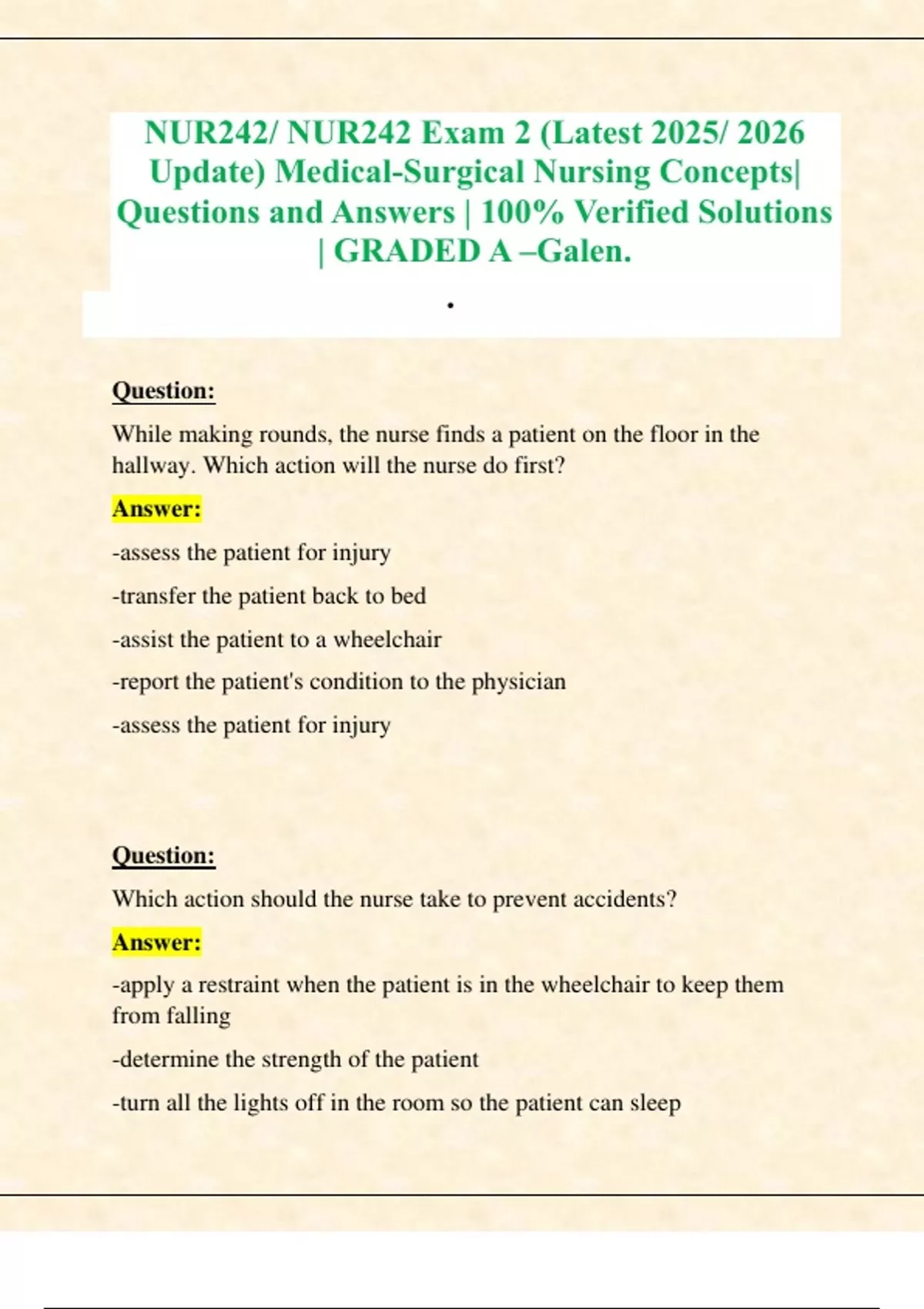 NUR242/ NUR242 Exam 2 (Latest 2025/ 2026 Update) Medical-Surgical Nursing Concepts| Questions and Answers | 100% Verified Solutions | GRADED A –Galen.