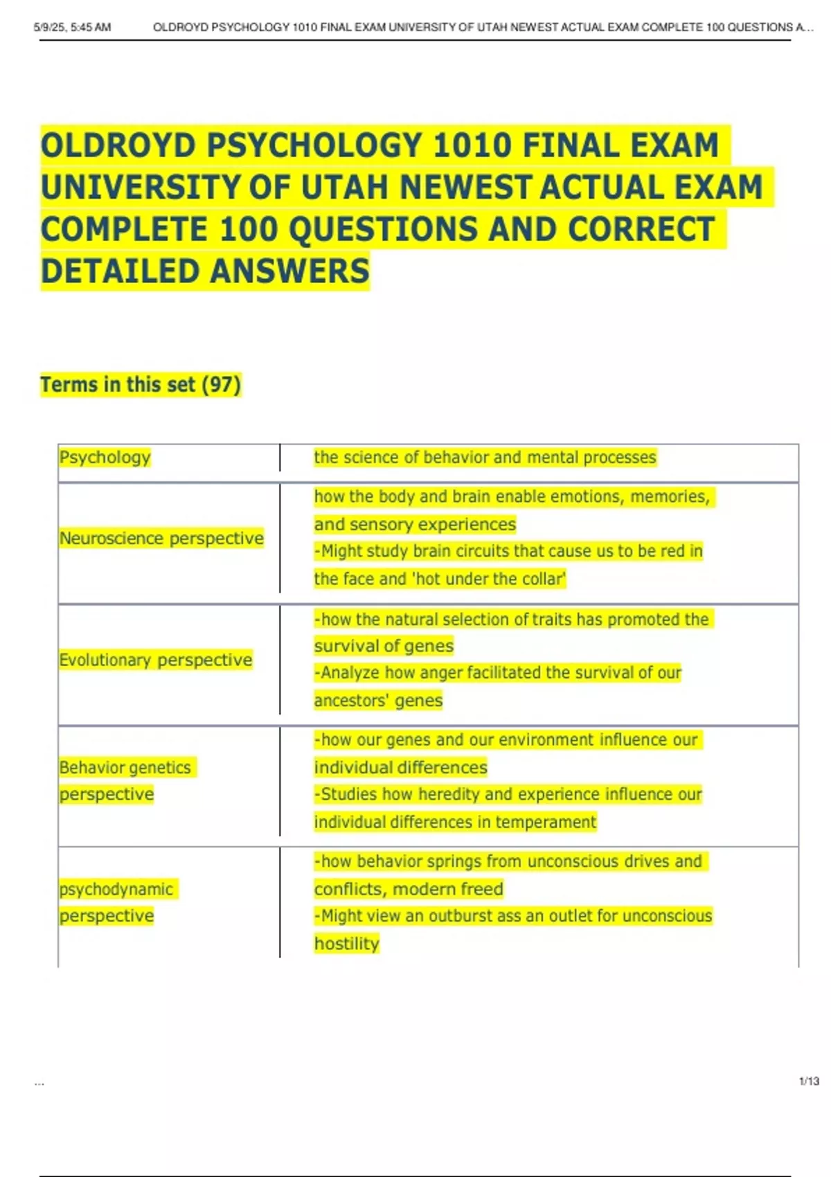 5/9/25, 5:45 AM OLDROYD PSYCHOLOGY 1010 FINAL EXAM UNIVERSITY OF UTAH NEWEST ACTUAL EXAM COMPLETE 100 QUESTIONS A…