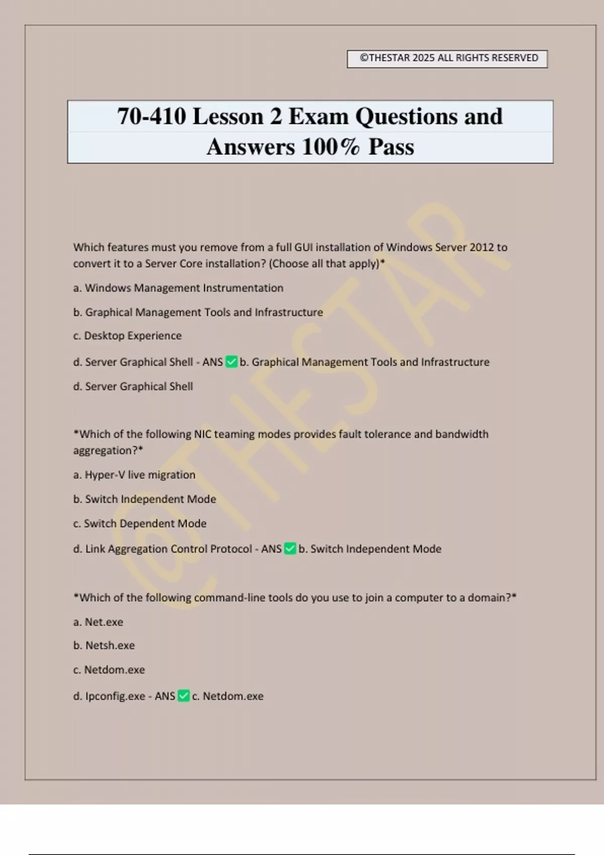 70-410 Lesson 2 Exam Questions and Answers 100% Pass Which features must you remove from a full GUI installation of Windows Server 2012 to convert it to a Server Core installation? (Choose all that apply)* a. Windows Management Instrumentation b. Graphical Management Tools and Infrastructure c. Desktop Experience d. Server Graphical Shell - ANS b. Graphical Management Tools and Infrastructure d. Server Graphical Shell *Which of the following NIC teaming modes provides fault tolerance and bandwidth aggregation?* a. Hyper-V live migration b. Switch Independent Mode c. Switch Dependent Mode d. Link Aggregation Control Protocol - ANS b. Switch Independent Mode *Which of the following command-line tools do you use to join a computer to a domain?* a. N b. N c. N d. I - ANS c. N