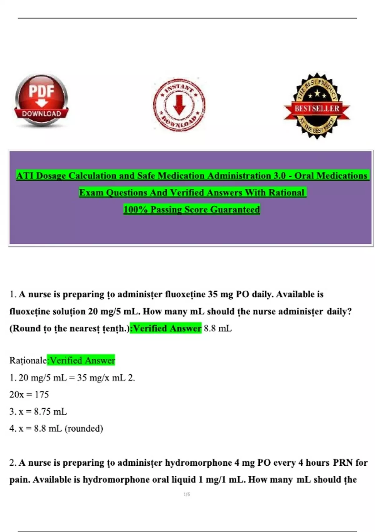 ATI Dosage Calculation and Safe Medicat...onal 100% Passing Score Guaranteed