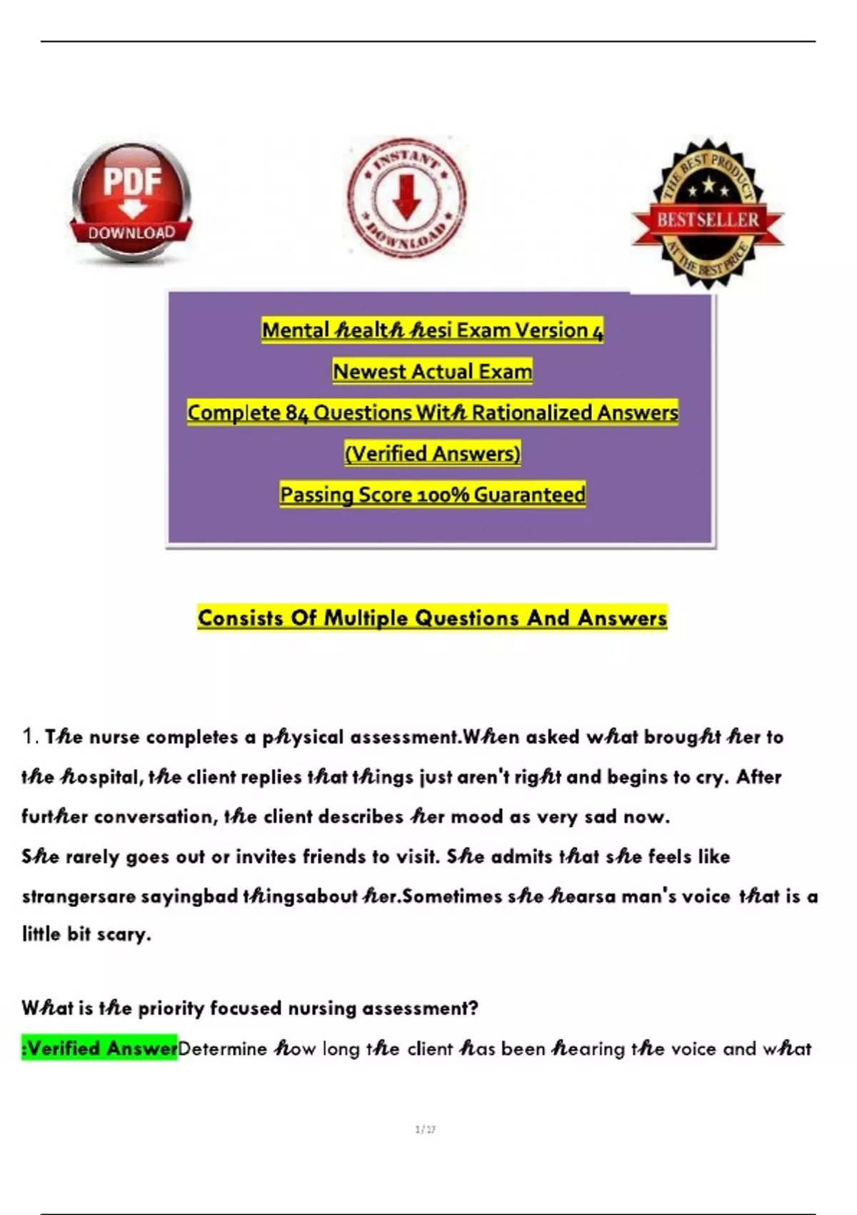 Mental Health Hesi Exam Version 4 Newes...ers) Passing Score 100 Guaranteed