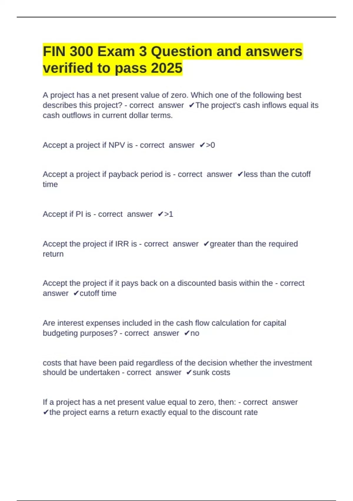 FIN 300 Exam 3 Question and answers verified to pass 2025 A project has a net present value of zero. Which one of the following best describes this project? - correct answer The project's cash inflows equal its cash outflows in current dollar terms. Accept a project if NPV is - correct answer 0 Accept a project if payback period is - correct answer less than the cutoff time Accept if PI is - correct answer 1 Accept the project if IRR is - correct answer greater than the required return Accept the project if it pays back on a discounted basis within the - correct answer cutoff time Are interest expenses included in the cash flow calculation for capital budgeting purposes? - correct answer no costs that have been paid regardless of the decision whether the investment should be undertaken - correct answer sunk costs