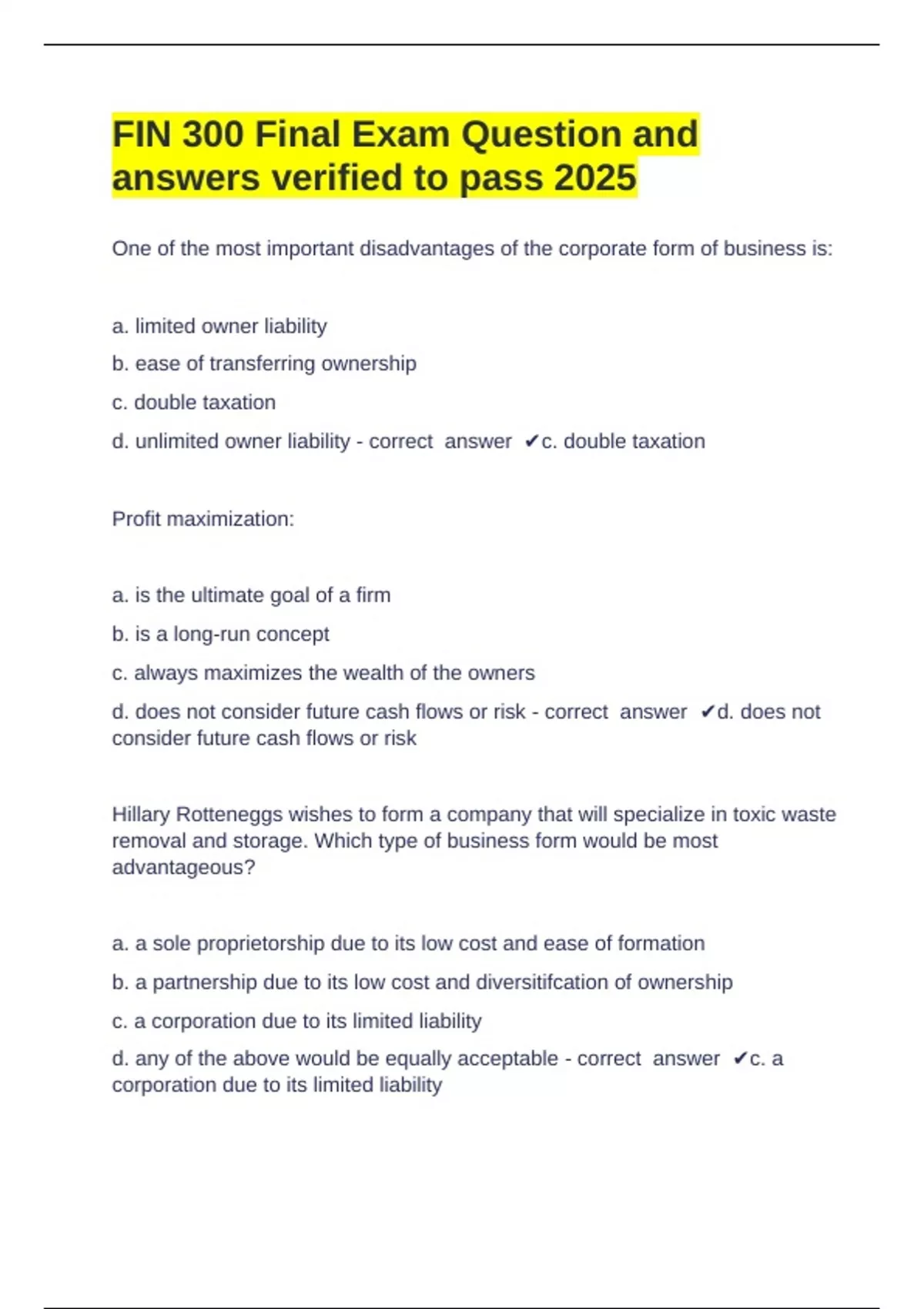 d. unlimited owner liability - correct answer ✔c. double taxation
