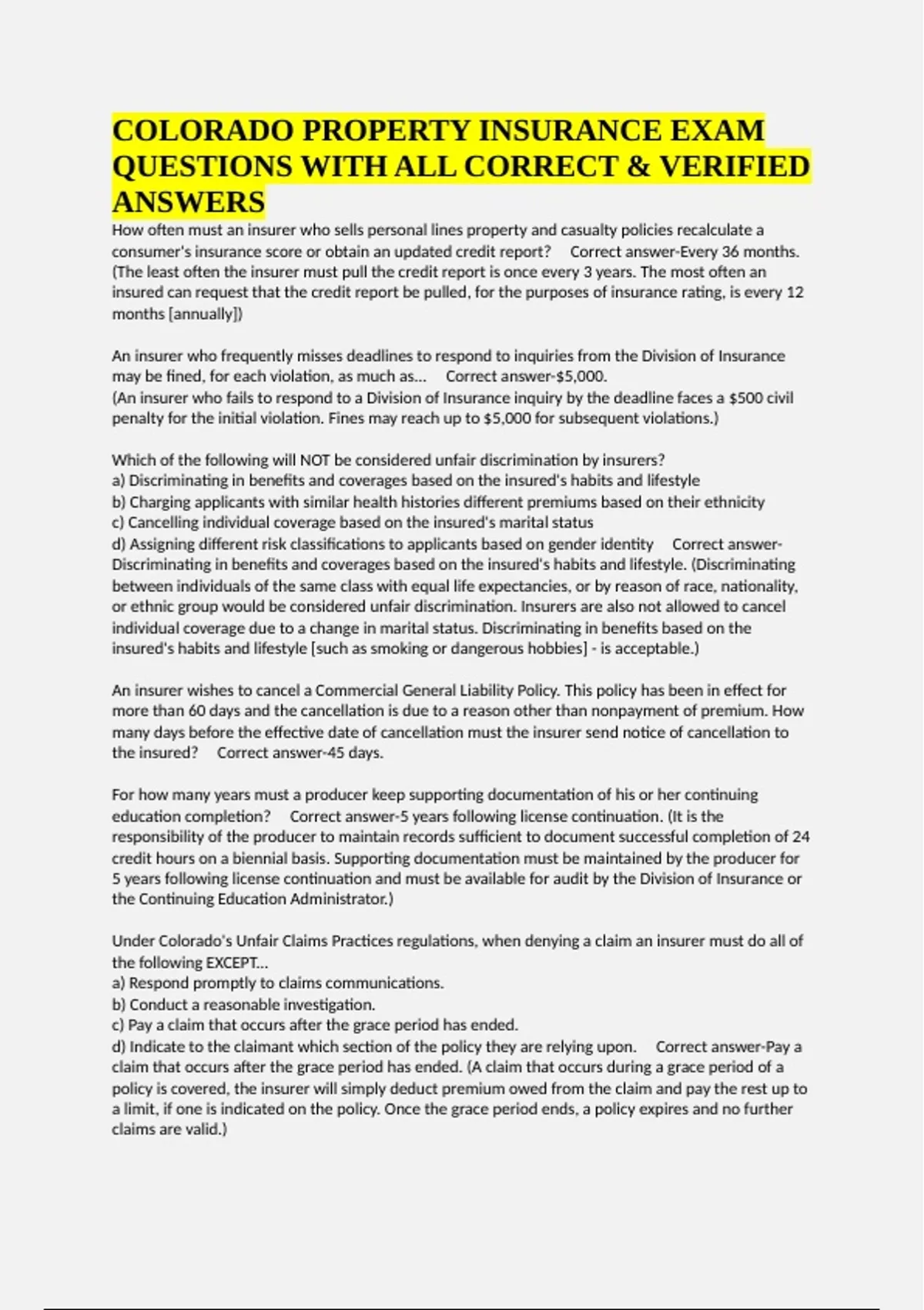 COLORADO PROPERTY INSURANCE EXAM QUESTIONS WITH ALL CORRECT & VERIFIED ANSWERS