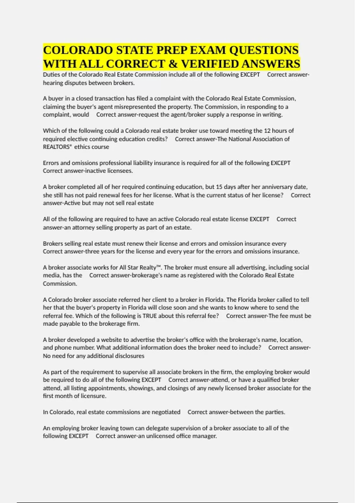 COLORADO STATE PREP EXAM QUESTIONS WITH ALL CORRECT & VERIFIED ANSWERS