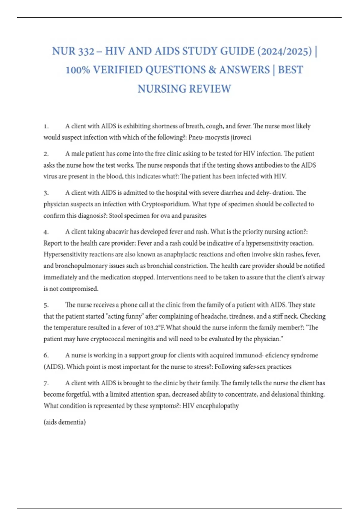 NUR 332 – HIV and AIDS Study Guide (2024/2025) | 100% Verified Questions & Answers | Best Nursing Review