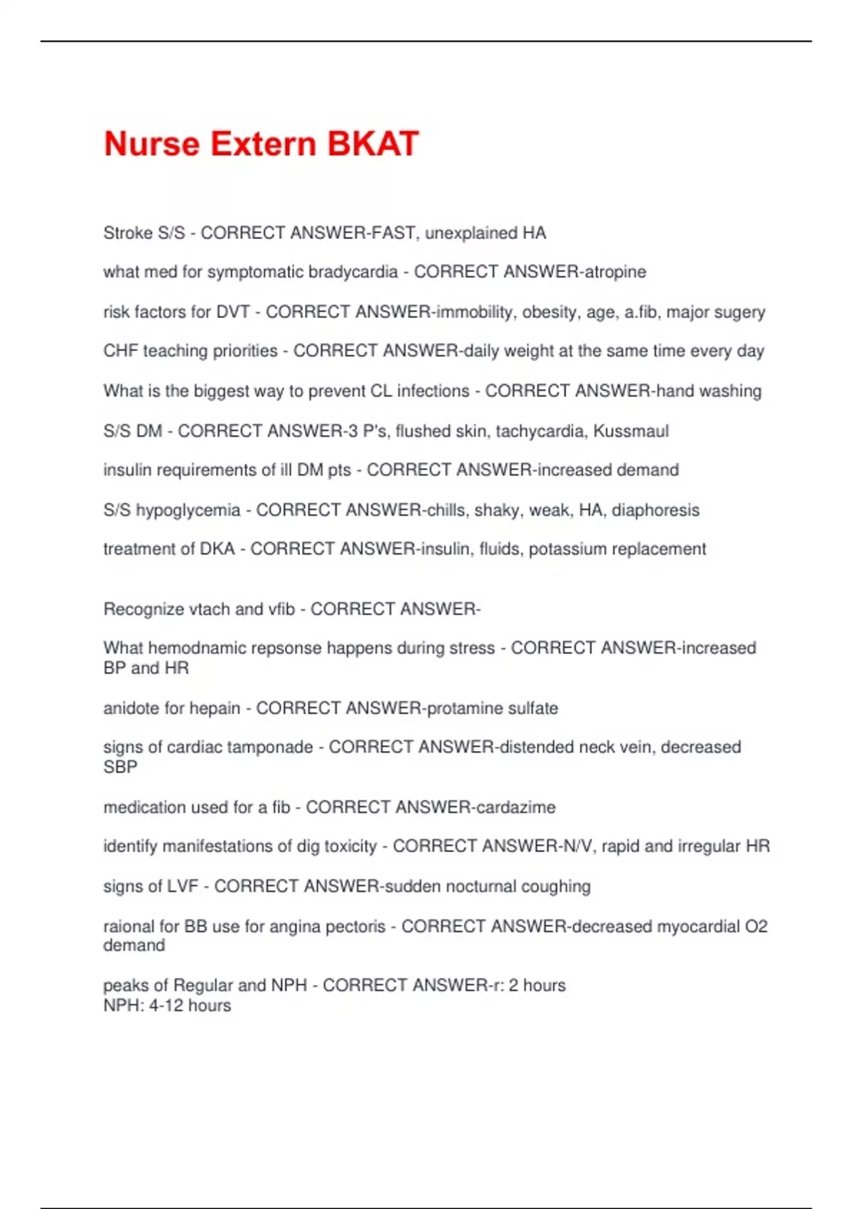 Stroke S/S - CORRECT ANSWER-FAST, unexplained HA what med for symptomatic bradycardia - CORRECT ANSWER-atropine risk factors for DVT - CORRECT ANSWER-immobility, obesity, age, , major sugery CHF teaching priorities - CORRECT ANSWER-daily weight at the same time every day What is the biggest way to prevent CL infections - CORRECT ANSWER-hand washing S/S DM - CORRECT ANSWER-3 P's, flushed skin, tachycardia, Kussmaul insulin requirements of ill DM pts - CORRECT ANSWER-increased demand S/S hypoglycemia - CORRECT ANSWER-chills, shaky, weak, HA, diaphoresis treatment of DKA - CORRECT ANSWER-insulin, fluids, potassium replacement