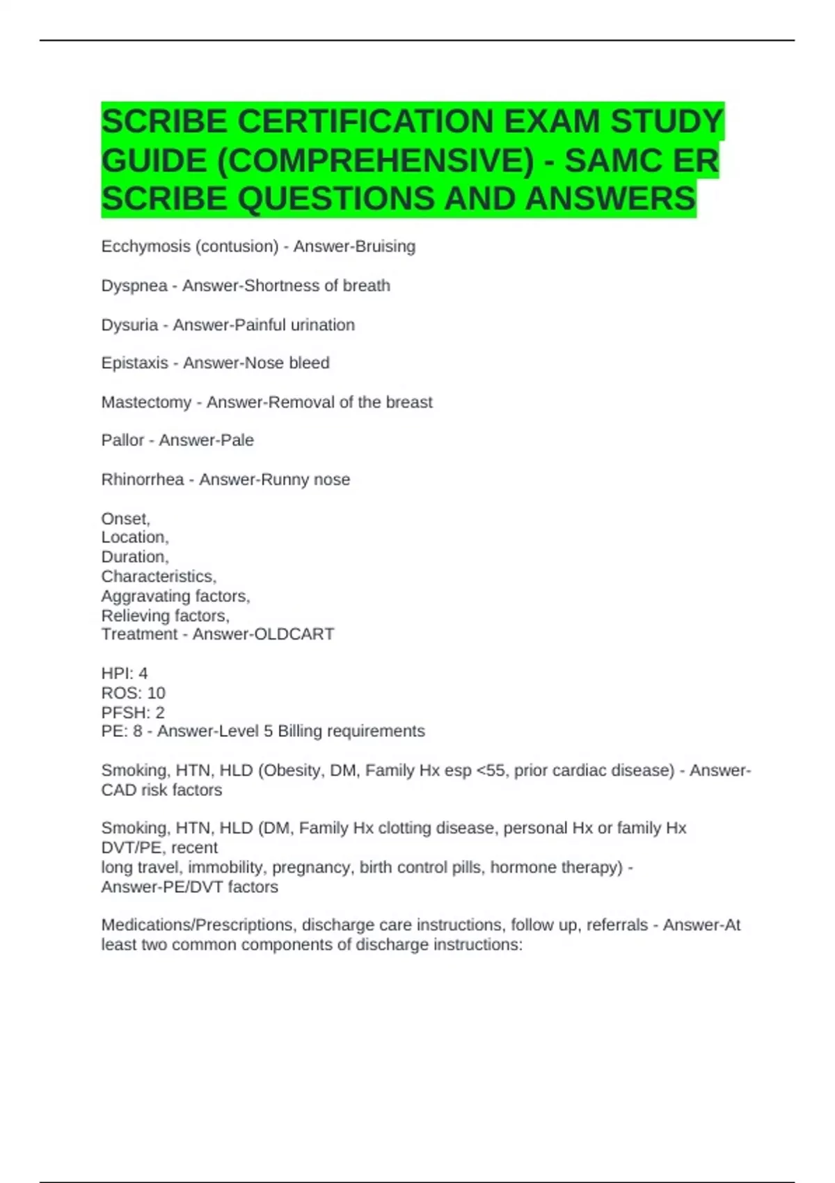 SCRIBE CERTIFICATION EXAM STUDY GUIDE (COMPREHENSIVE) - SAMC ER SCRIBE QUESTIONS AND ANSWERS