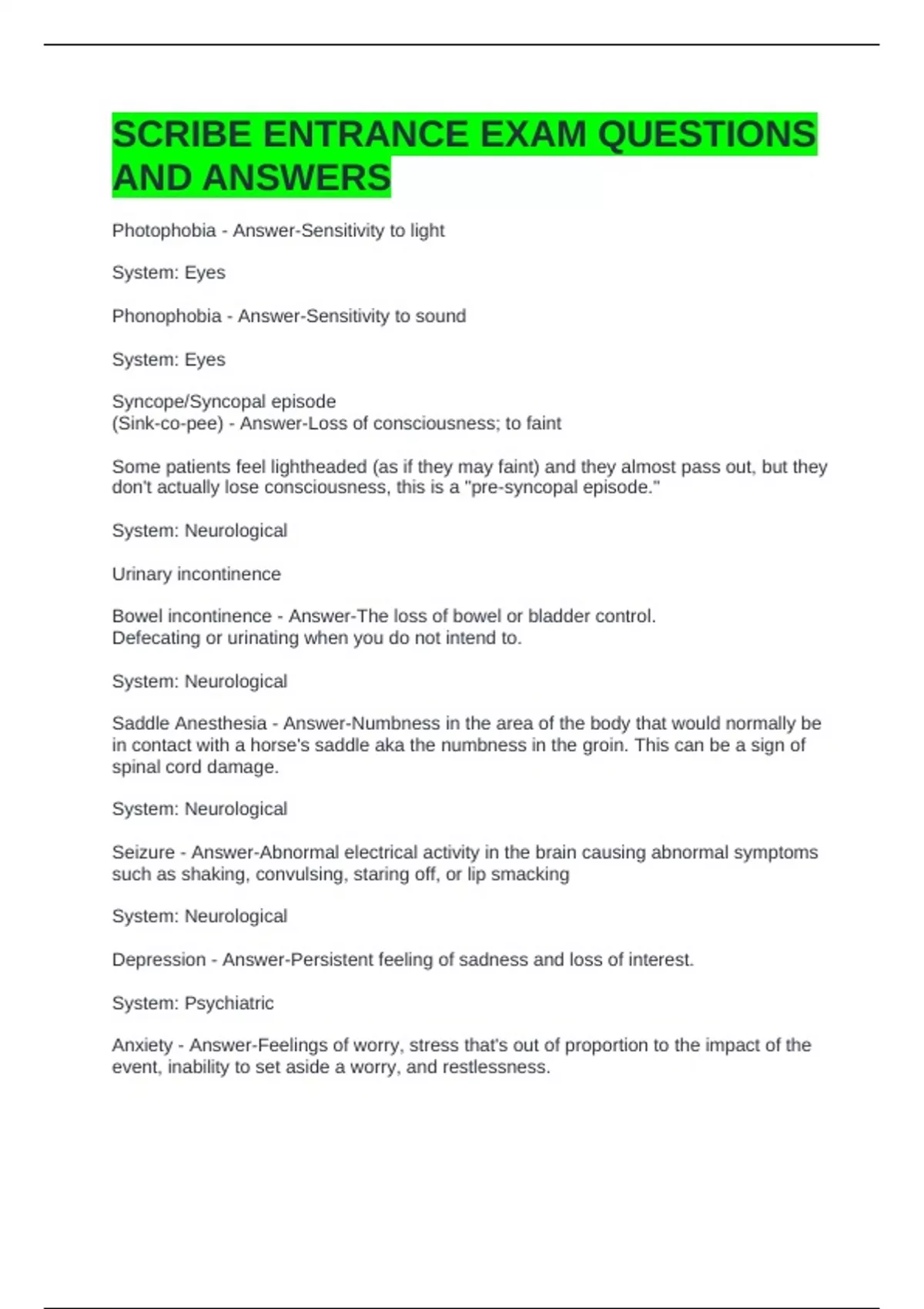 SCRIBE ENTRANCE EXAM QUESTIONS AND ANSWERS