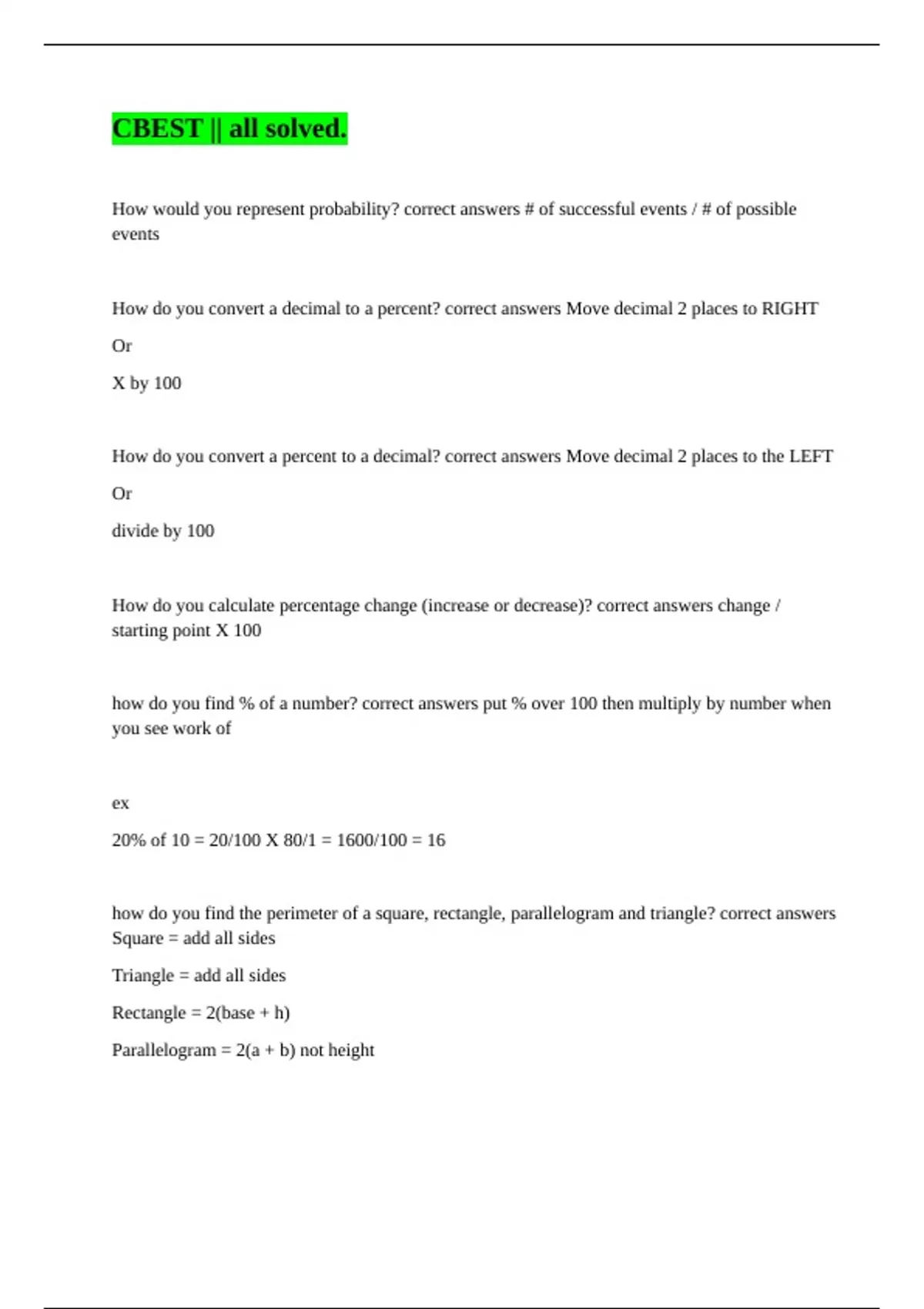 How would you represent probability? correct answers # of successful events / # of possible events How do you convert a decimal to a percent? correct answers Move decimal 2 places to RIGHT Or X by 100 How do you convert a percent to a decimal? correct answers Move decimal 2 places to the LEFT Or divide by 100 How do you calculate percentage change (increase or decrease)? correct answers change / starting point X 100 how do you find % of a number? correct answers put % over 100 then multiply by number when you see work of ex 20% of 10 = 20/100 X 80/1 = 1600/100 = 16 how do you find the perimeter of a square, rectangle, parallelogram and triangle? correct answers Square = add all sides Triangle = add all sides Rectangle = 2(base + h) Parallelogram = 2(a + b) not height