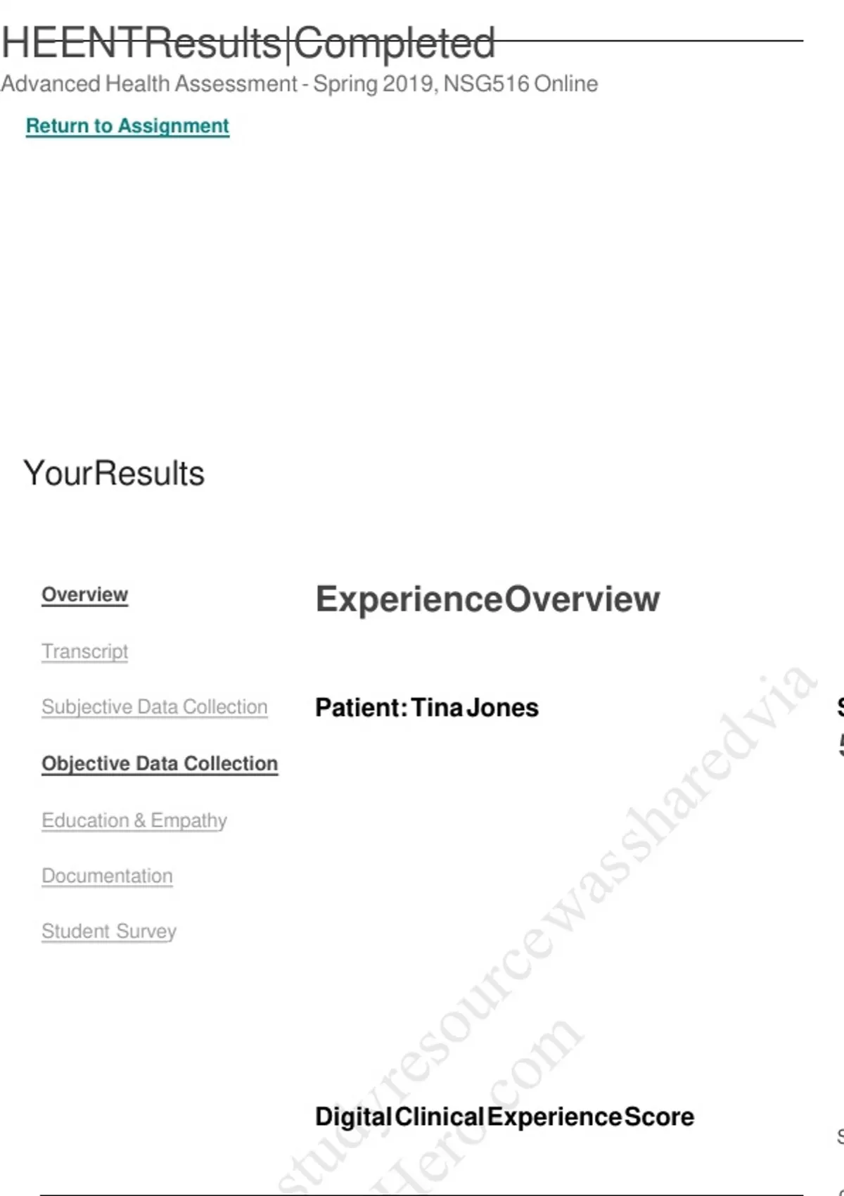 Summary NSG 516 Tina Jones Objective HEENT | Completed | Shadow Health 3_Already Graded A