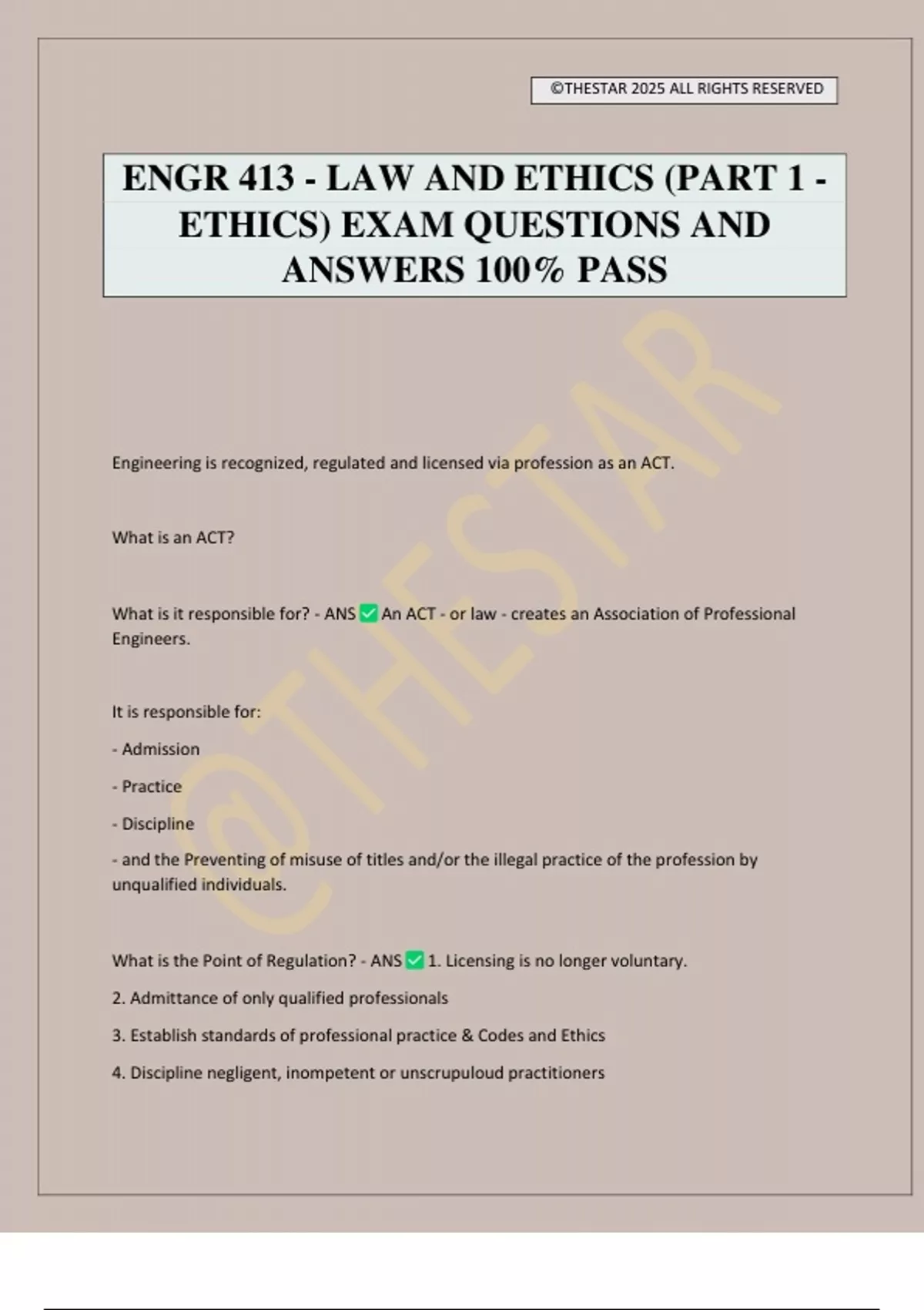 ENGR 413 - LAW AND ETHICS (PART 1 - ETHICS) EXAM QUESTIONS AND ANSWERS 100% PASS Engineering is recognized, regulated and licensed via profession as an ACT. What is an ACT? What is it responsible for? - ANS An ACT - or law - creates an Association of Professional Engineers. It is responsible for: - Admission - Practice - Discipline - and the Preventing of misuse of titles and/or the illegal practice of the profession by unqualified individuals. What is the Point of Regulation? - ANS 1. Licensing is no longer voluntary. 2. Admittance of only qualified professionals 3. Establish standards of professional practice & Codes and Ethics 4. Discipline negligent, inompetent or unscrupuloud practitioners ©THESTAR 2025 ALL RIGHTS RESERVED What is a "Self-regulating" system? - ANS A Self-selected and self-disciplined group which have special skills derived from education and training and exercise these skills in the interest of others. What is the Practice of Professional Engineering? - ANS Any act of planning, designing, composing, evaluating, advising, reporting, directing or supervising, or managing any of the foregoing, that requires the application of engineering principles and that concerns the safeguarding of life, health, property, economic interests, the public welfare or the environment. What is the difference between a Regulation and a Bylaw? - ANS A regulation is a rule that clarifies the Act, whereas a Bylaw is a rule that governs the *operation* of the Association Those who go to a //BLANK// accredited school do not require additional testing. - ANS C E A B . AKA the Canadian Engineering Accreditation Board Those who do not have a CEAB accredited engineering degree require how many years of supervision is required to be considered for a P.ENG? - ANS *Four years with a minimum of 1 year Canadian work. To be considered for a P.Eng, what must you satisfy in your background? - ANS 1. Application of theory. 2. Practical experience. 3. Management of engineering. 4. Communication skills. 5. Social implications of engineering.