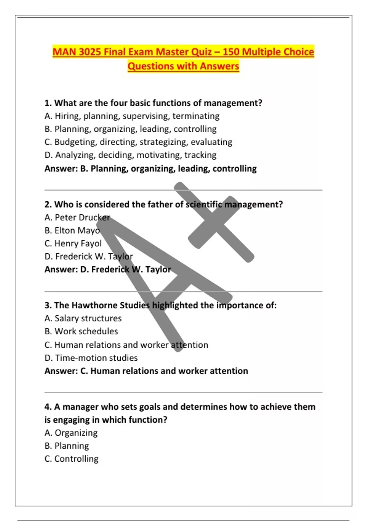 MAN 3025 Final Exam Master Quiz – 150 Multiple Choice