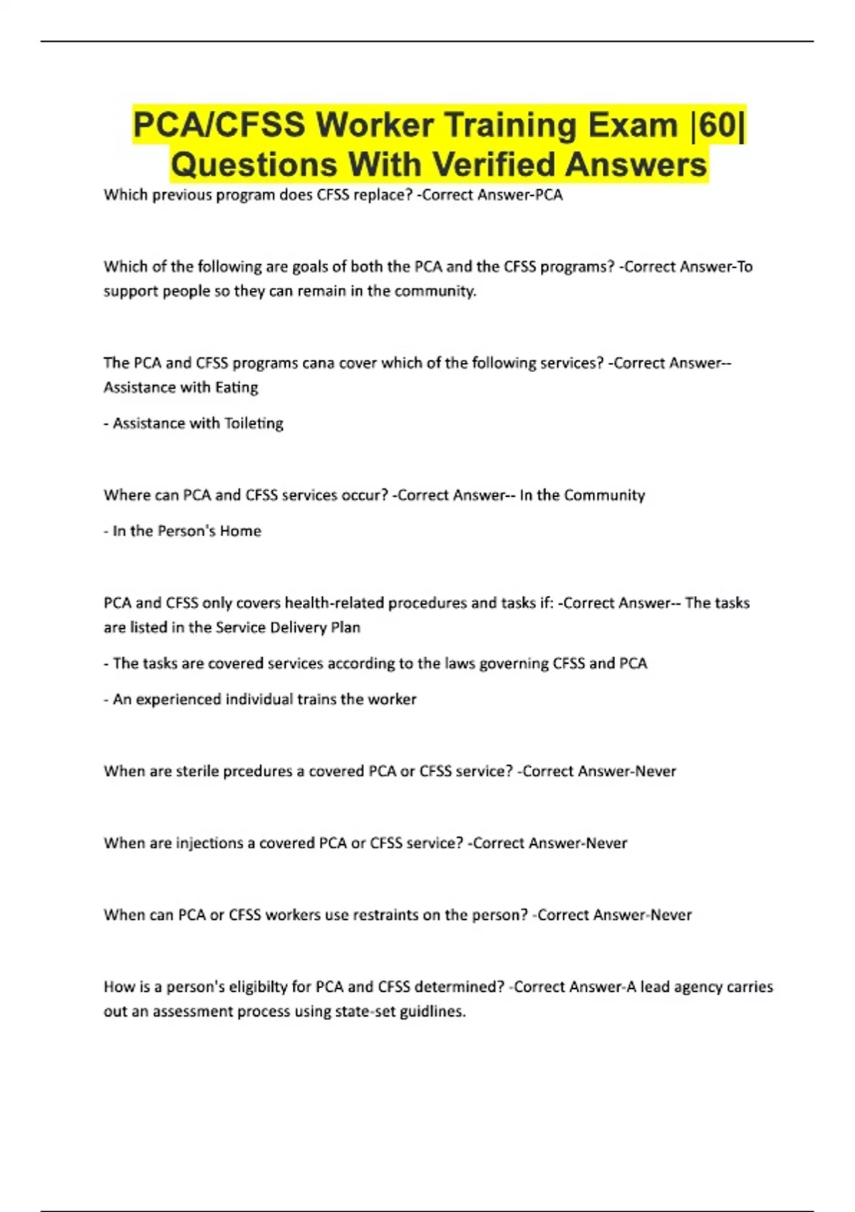 PCA/CFSS Worker Training Exam |60| Questions With Verified Answers Which previous program does CFSS replace? -Correct Answer-PCA Which of the following are goals of both the PCA and the CFSS programs? -Correct Answer-To support people so they can remain in the community. The PCA and CFSS programs cana cover which of the following services? -Correct Answer-- Assistance with Eating - Assistance with Toileting Where can PCA and CFSS services occur? -Correct Answer-- In the Community - In the Person's Home PCA and CFSS only covers health-related procedures and tasks if: -Correct Answer-- The tasks are listed in the Service Delivery Plan - The tasks are covered services according to the laws governing CFSS and PCA - An experienced individual trains the worker When are sterile prcedures a covered PCA or CFSS service? -Correct Answer-Never When are injections a covered PCA or CFSS service? -Correct Answer-Never When can PCA or CFSS workers use restraints on the person? -Correct Answer-Never How is a person's eligibilty for PCA and CFSS determined? -Correct Answer-A lead agency carries out an assessment process using state-set guidlines. Who can be a CFSS worker that could not be a PCA worker? -Correct Answer-- A person receiving CFSS services - The parents of a minor person - The person's spouse In PCA, the QP assists the person with developing their plan. in CFSS, who performs this task? -Correct Answer-Consultation services is available to assist with the development of the plan In PCA, the Qualified Professional ensures the competency of the worker, monitors and evaluates the worker and ensures the person's health and safety needs are met. In CFSS, who performs these tasks? -Correct Answer-- In the budget model, the petrson or individual with the training or experience performs these tasks. - In the agency model, one or more agency employees with the training or experience performs these tasks. A person uses a wheelchair in some situations, and walks in others. Which of the following represents a person-centered approach? -Correct Answer-- Ask the person if they would like you to push when they're using the wheelchair. - Support the person's decision about when to use their wheelchair. A person ha
