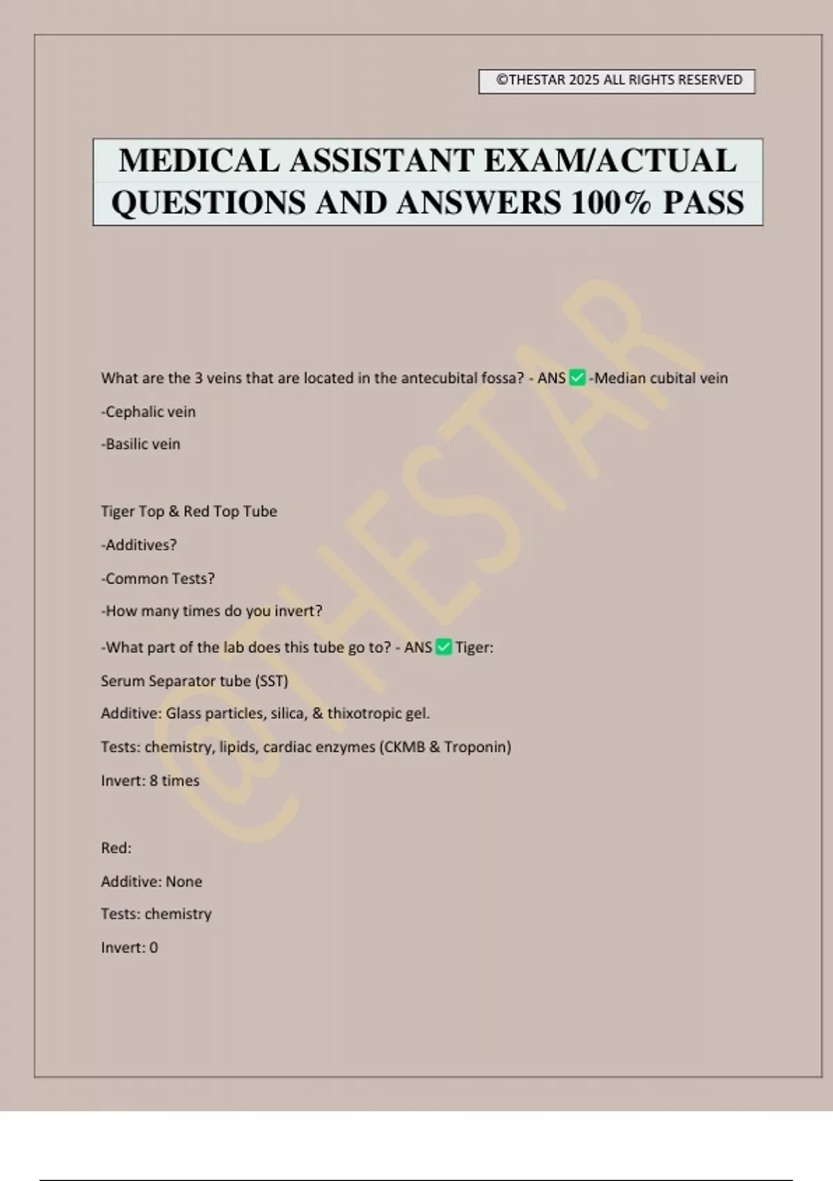 MEDICAL ASSISTANT EXAM/ACTUAL QUESTIONS AND ANSWERS 100% PASS What are the 3 veins that are located in the antecubital fossa? - ANS -Median cubital vein -Cephalic vein -Basilic vein Tiger Top & Red Top Tube -Additives? -Common Tests? -How many times do you invert? -What part of the lab does this tube go to? - ANS Tiger: Serum Separator tube (SST) Additive: Glass particles, silica, & thixotropic gel. Tests: chemistry, lipids, cardiac enzymes (CKMB & Troponin) Invert: 8 times Red: Additive: None Tests: chemistry Invert: 0 ©THESTAR 2025 ALL RIGHTS RESERVED Chemistry part of the lab Gray Top Tubes -Additives? -Common Tests? -How many times do you invert? -What part of the lab does this tube go to? - ANS Additives: Sodium fluoride & Potassium Oxalate Common tests: Fasting blood sugar, Glucose tolerance test (GTT), blood alcohol levels, and lactic acid measurements Invert: 8 times Chemistry part of the lab Green Top Tubes -Additives? -Common tests? -How many times do you invert? -What part of the lab does this tube go to? - ANS Additives: Heparin, Sodium, lithium or ammonium-ion Tests: Ammonia, Carboxyhemoglobin, and STAT electrolytes Invert: 8 times Chemistry part of the lab ©THESTAR 2025 ALL RIGHTS RESERVED Lavender Top Tube -Additives? -Common tests? -How many times do you invert? -What part of the lab does this tube go to? - ANS **MUST fill tube 2/3** Additives: EDTA (Ethylenediaminetetraacetic acid) Tests: CBC (RBC, WBC, and Platelet), WBC differential, Hemoglobin & Hematocrit determinations, Erythrocyte sedimentation Rate (ESR)/ SED rate, sickle cell screening, and lead levels. Invert: 8 times Hematology part of the lab Light Blue Top Tube -Additives? -Common Tests? -How many times do you need to invert? -What part of the lab does this tube go to? - ANS **Needs to be filled completely** **9 parts blood to 1 part sodium** Additives: Sodium Citrate Common tests: Prothrombin Time (PT), Coumadin Therapy, Activated Partial Thromboplastin Time (PTT), Monitors heparin therapy and bleeding time.