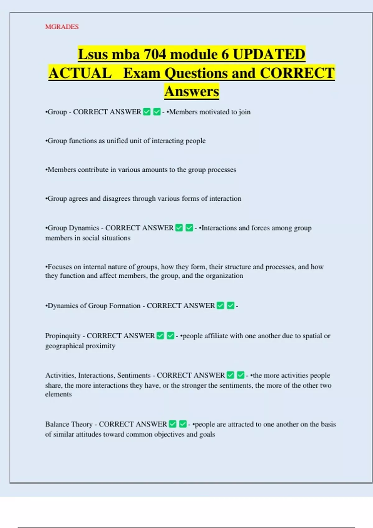 Lsus mba 704 module 6 UPDATED ACTUAL Exam Questions and CORRECT Answers •Group - CORRECT ANSWER - •Members motivated to join •Group functions as unified unit of interacting people •Members contribute in various amounts to the group processes •Group agrees and disagrees through various forms of interaction •Group Dynamics - CORRECT ANSWER members in social situations - •Interactions and forces among gr