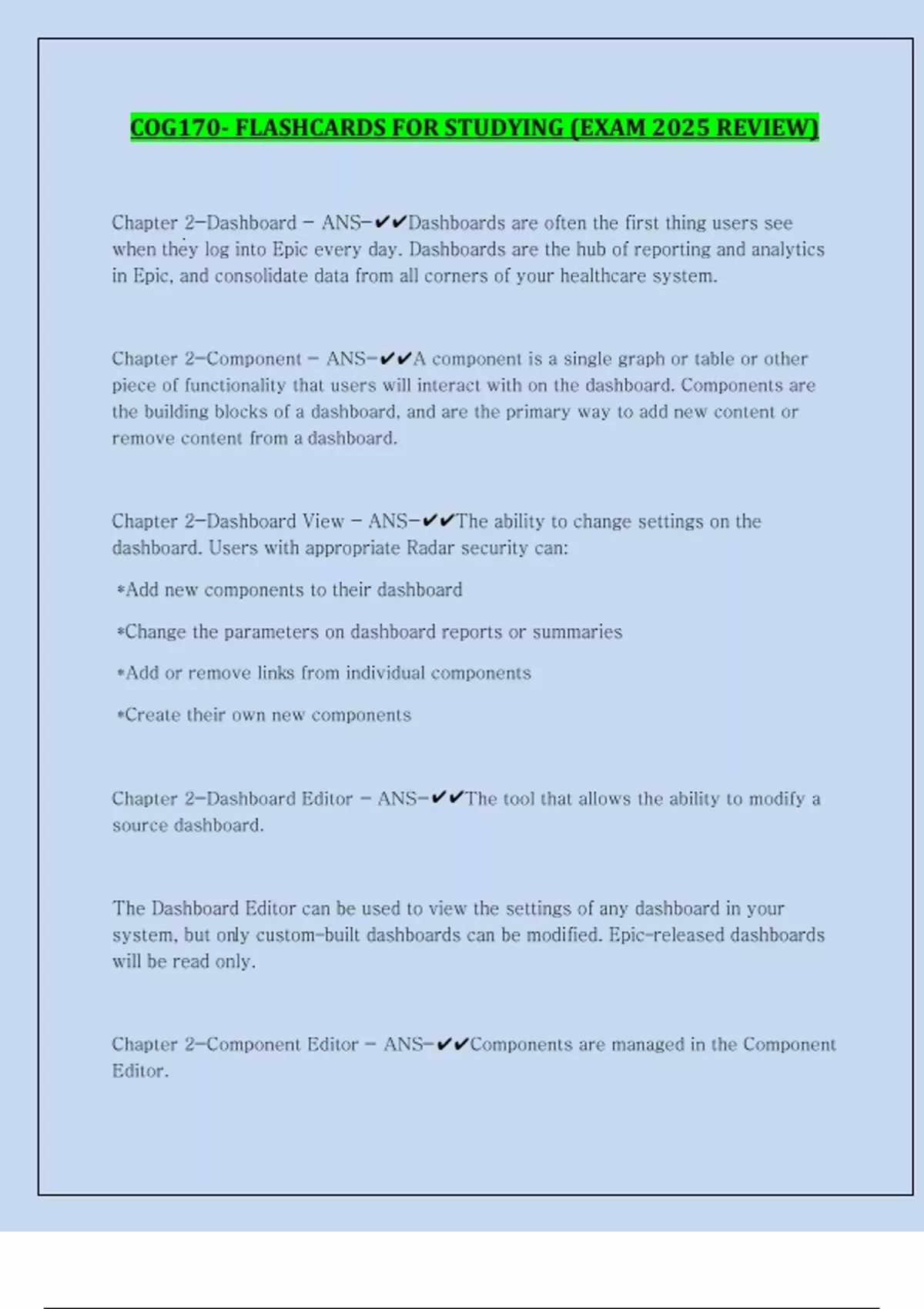COG170- FLASHCARDS FOR STUDYING (EXAM 2025 REVIEW) Chapter 2-Dashboard - ANS-Dashboards are often the first thing users see when they log into Epic every day. Dashboards are the hub of reporting and analytics in Epic, and consolidate data from all corners of your healthcare system. Chapter 2-Component - ANS-A component is a single graph or table or other piece of functionality that users will interact with on the dashboard. Components are the building blocks of a dashboard, and are the primary way to add new content or remove content from a dashboard. Chapter 2-Dashboard View - ANS-The ability to change settings on the dashboard. Users with appropriate Radar security can: *Add new components to their dashboard *Change the parameters on dashboard reports or summaries *Add or remove links from individual components *Create their own new components Chapter 2-Dashboard Editor - ANS-The tool that allows the ability to modify a source dashboard. The Dashboard Editor can be used to view the settings of any dashboard in your system, but only custom‐built dashboards can be modified. Epic‐released dashboards will be read only. Chapter 2-Component Editor - ANS-