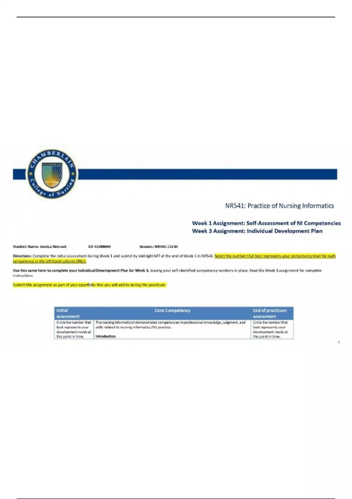 NR 541 Week 1 Assignment: Self-Assessment of NI Competencies | 2025 Update with complete solutions.