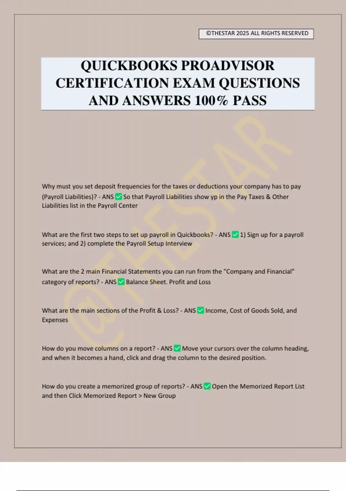 QUICKBOOKS PROADVISOR CERTIFICATION EXAM QUESTIONS AND ANSWERS 100% PASS Why must you set deposit frequencies for the taxes or deductions your company has to pay (Payroll Liabilities)? - ANS So that Payroll Liabilities show yp in the Pay Taxes & Other Liabilities list in the Payroll Center What are the first two steps to set up payroll in Quickbooks? - ANS 1) Sign up for a payroll services; and 2) complete the Payroll Setup Interview What are the 2 main Financial Statements you can run from the "Company and Financial" category of reports? - ANS Balance Sheet. Profit and Loss What are the main sections of the Profit & Loss? - ANS Income, Cost of Goods Sold, and Expenses How do you move columns on a report? - ANS Move your cursors over the column heading, and when it becomes a hand, click and drag the column to the desired position. How do you create a memorized group of reports? - ANS Open the Memorized Report List and then Click Memorized Report > New Group ©THESTAR 2025 ALL RIGHTS RESERVED What happens if you double-click a diamond on a report column? - ANS None of the above Which of the following reports answers the question "What transactions make up the current balance I owe each Vendor"? - ANS Vendor Balance Detail You sent Quickbooks a report to Excel and made some changes. How do you import the changes back to Quickbooks? - ANS You can't import changes in Excel back to Quickbooks. You've been hired by a company that started in 1911. They've never used QuickBooks. During the Advanced/Detailed Setup, what "State Date" should you use in the EasyStep Interview? - ANS The date you want to begin tracking the company's finances in Quickbooks. Which of the following CANNOT be entered during the setup of a new company (Express Start or Advanced/Detailed Setup) file? - ANS Trial Balance opening balances How do you customize Quickbooks by changing the color scheme and adding or removing icons from the Home page? - ANS Choose Edit > Preferences > Desktop View ??? - ANS Click the Formatting Tab at the top of the form; then click Customize Data Layout You need to enter the same transaction each month (for example, an insurance payment). How can you automate this process in Quickbooks? - ANS While the transaction is on the screen, choose Edit > Memorize check (or the name of the transaction). How do you set up multiple users in QuickBooks Pro or Premier? - ANS Choose Company > Set Up Users and Passwords > Set Up Users What is the maximum number of names that cab be included on he Names lists in QuickBooks Pro or Premier? - ANS 14,500