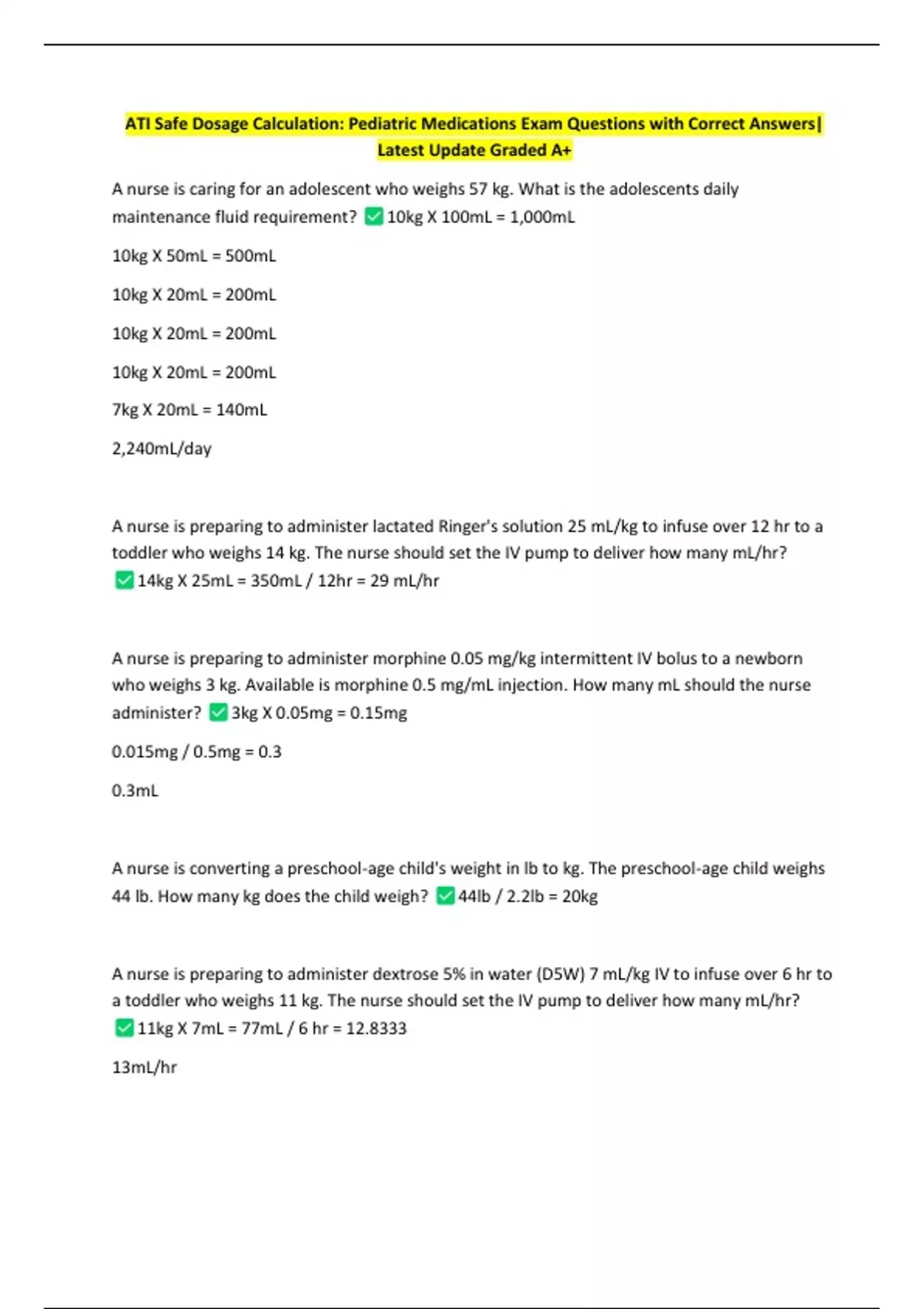 ATI Safe Dosage Calculation: Pediatric Medications Exam Questions with Correct Answers| Latest Update Graded A+