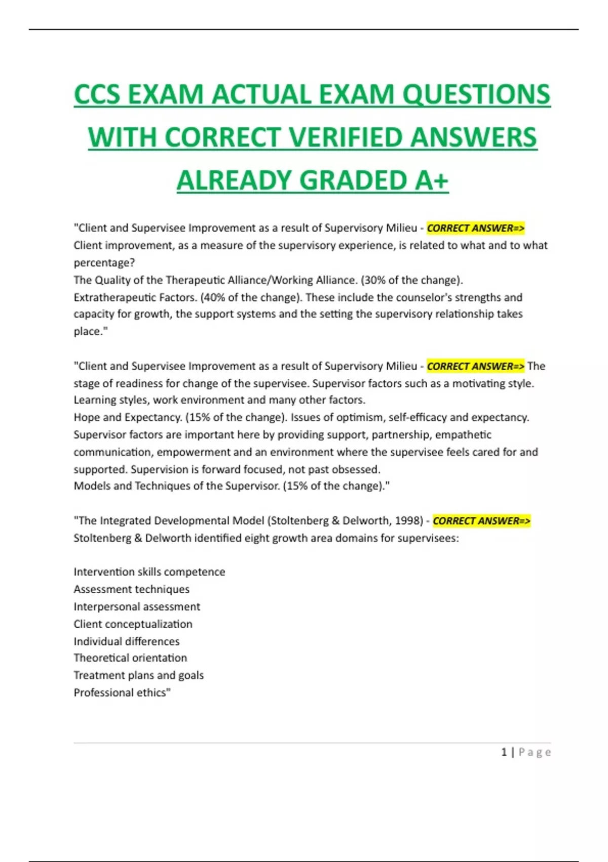 "Client and Supervisee Improvement as a result of Supervisory Milieu - CORRECT ANSWER=>