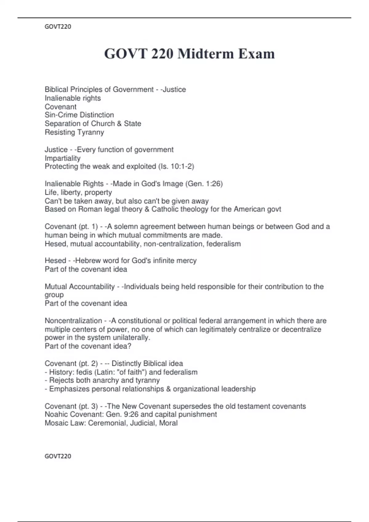 Biblical Principles of Government - -Justice Inalienable rights Covenant Sin-Crime Distinction Separation of Church & State Resisting Tyranny Justice - -Every function of government Impartiality Protecting the weak and exploited (Is. 10:1-2) Inalienable Rights - -Made in God's Image (Gen. 1:26) Life, liberty, property Can't be taken away, but also can't be given away Based on Roman legal theory & Catholic theology for the American govt Covenant (pt. 1) - -A solemn agreement between human beings or between God and a human being in which mutual commitments are made. Hesed, mutual accountability, non-centralization, federalism Hesed - -Hebrew word for God's infinite mercy Part of the covenant idea Mutual Accountability - -Individuals being held responsible for their contribution to the group Part of the covenant idea Noncentralization - -A constitutional or political federal arrangement in which there are multiple centers of power, no one of which can legitimately centralize or decentralize power in the system unilaterally. Part of the covenant idea? Covenant (pt. 2) - -- Distinctly Biblical idea - History: fedis (Latin: "of faith") and federalism - Rejects both anarchy and tyranny - Emphasizes personal relationships & organizational leadership Covenant (pt. 3) - -The New Covenant supersedes the old testament covenants Noahic Covenant: Gen. 9:26 and capital punishment Mosaic Law: Ceremonial, Judicial, Moral Federalism - -A system in which power is divided between the national and state governments Part of the covenant idea. Sin-Crime Distinction - -"All crimes are sins, but not all sins are crimes." Ex. it's both a sin and a crime to murder, but it's only a sin to have lust, not a crime. The government can't police inside your head Institutional Separation of Church and State - -Forbids governmental establishment or preference of a religion and preserves religious freedom from governmental intrusion - ensures freedom of conscience - ex: Old Testament theocracy; ex: Christ did not seek a political kingdom - Sin-Crime distinction - Limits on social welfare policy Doctrine of the Two Swords - -Roman Catholic interpretation of Luke 22:38 The pope possessed both swords, but had granted the temporal sword to rulers; therefore, the papacy had the right to depose kings and emperors. Resisting Tyranny - -Tyranny is a material breach of the covenant - Locke: state of nature/state of war - Interposition and voting are two ways to resist tyranny - "Selfless" self-defense Constitution - -· Rights and Powers assigned in Constitution · Discussion of 3/5th Provision · Hypotheticals pertaining to a "Pure Split" at the Convention over slavery · The heart of tyranny and legalism as it pertains to slavery · Inalienable Rights · Resisting Tyranny · Petulant Individualism vs. Conservatism · Leftist Radicalism vs. Biblical Radicalism · Origin of conservative resistance to Civil Rights · Barry Goldwater's opposition to the Civil Rights Act · Populism and demagoguery vs. grassroots/non-centralization Constitution (pt. 2) - -Process took approx. 10 yrs Remarkably peaceful Important early lessons and experiences shaped the document Other influences include political philosophers, British constitutional and legal history Rights and Powers assigned in Constitution - -State Constitutions: - Separation of Powers - Bicameral legislation - Weak governors - Property restrictions for voting and holding office (when state constitutions were first a thing) - Based on covenantal ideas Articles of Confederation - -- First national constitution - Weak national government - Key provisions: State sovereignty & equality; limited powers; super-majority requirement; amendments - Weak 3/5ths Compromise/Provision - -Any person who was not free would be counted as three-fifths of a free individual for the purposes of determining congressional representation to increase the political power of slave holding states. Hypotheticals pertaining to a "Pure Split" at the Convention over slavery - -This was a discussion about what would have happened if the anti-slavery states had decided not to form a union with slave states and the two groups had just gone their separate ways. It's possible that such a separation might have actually made it harder to overturn slavery. The heart of tyranny and legalism as it pertains to slavery - -Rebel orphan slave might have something to do with this??? Tyranny takes away the right to life, liberty, & property Legalism is tyranny. Inalienable Rights (again) - -See previous card about this Resisting Tyranny (again) - -See previous card about this Petulant Individualism vs. Conservatism - -There is a difference between self-government, which embraces both limited (state) government and love of one's neighbor, and selfish individualism. Leftist Radicalism vs. Biblical Radicalism - -Leftist Radicalism: no absolutes, life is ours to choose. Combine w/definition of Liberal Biblical radicalism: Be such an image of Christ that we are radically different from the rest of the world Origin of conservative resistance to Civil Rights - -Conservative resistance to Civil Rights came from thinking that Civil Rights were a liberal idea rather than an inherent human right. Barry Goldwater's opposition to the Civil Rights Act - -Goldwater supported the Civil Rights Acts of 1957 and 1960 and the 24th Amendment to the U.S. Constitution, but, in a decision that he later said anguished him because of his belief in racial equality, he opposed the Civil Rights Act of 1964 on the basis that two of its provisions, specifically Title II and Title VII, were unconstitutional and a potential overreach of the federal government. Social equality was not something that the federal government should properly guarantee Title II - Outlawed discrimination based on race, color, religion, or national origin in hotels, motels, restaurants, theaters, and all other public accommodations engaged in interstate commerce; the Title defined "publi