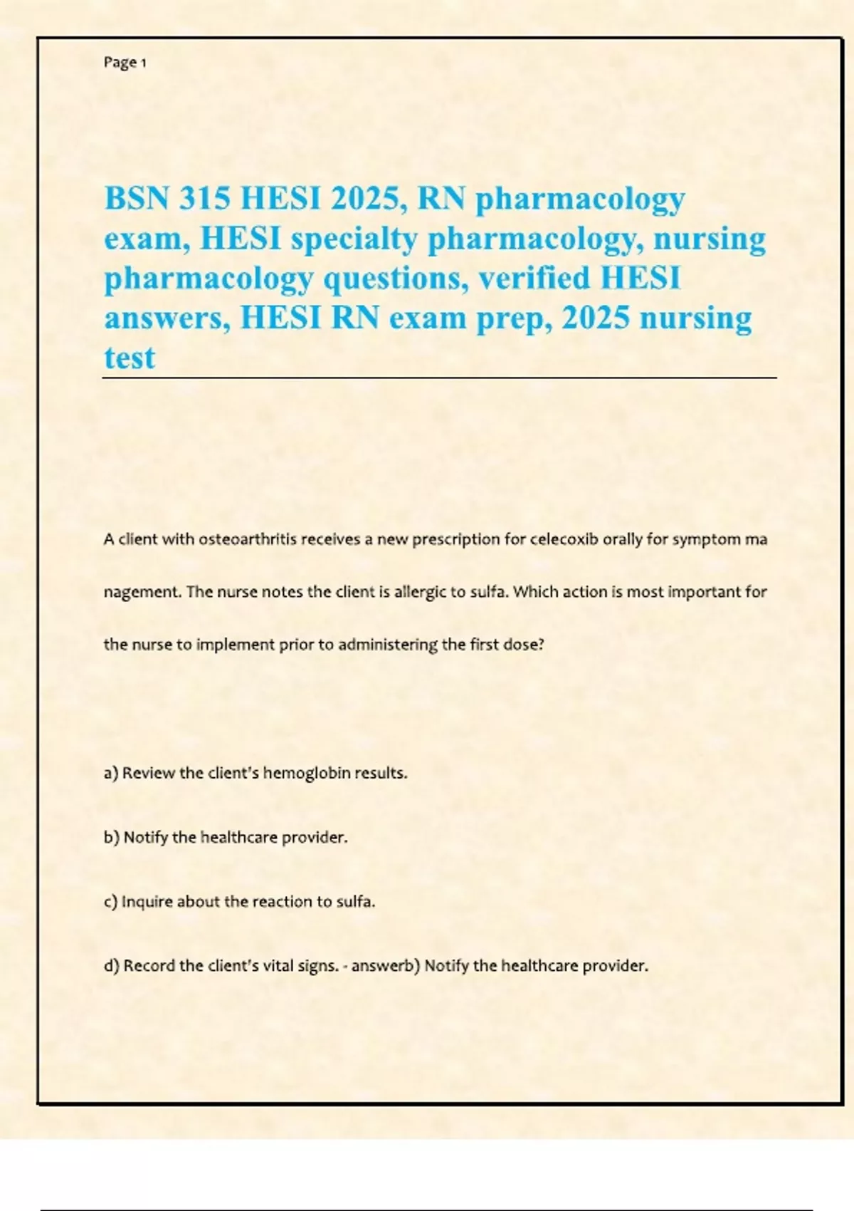 BSN 315 HESI PHARMACOLOGY EXAM 2025 | ALL QUESTIONS AND CORRECT ANSWERS | VERIFIED ANSWERS | LATEST VERSION 2025 | ALREADY GRADED A+.