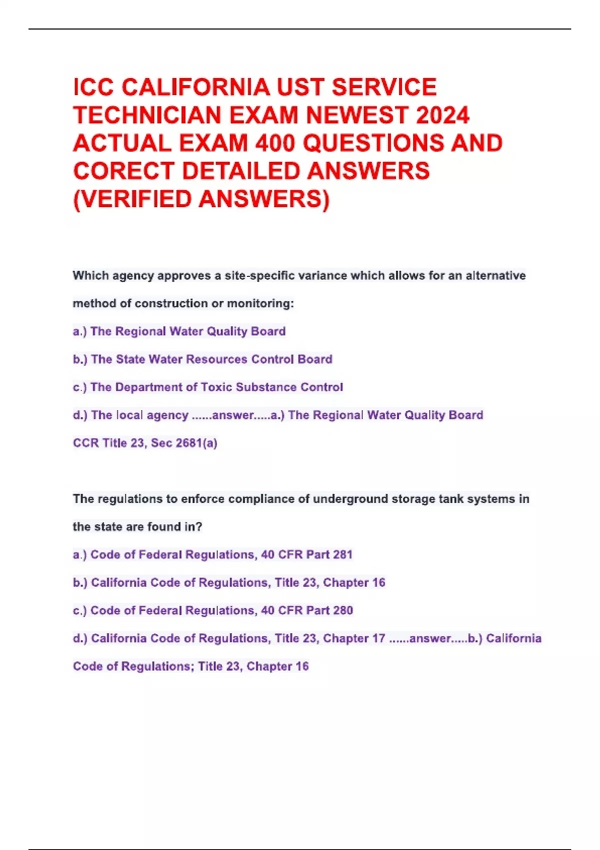 ICC CALIFORNIA UST SERVICE TECHNICIAN EXAM NEWEST 2024 ACTUAL EXAM 400 QUESTIONS AND CORECT DETAILED ANSWERS