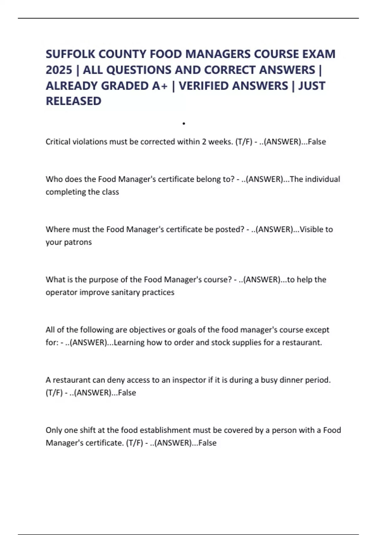 SUFFOLK COUNTY FOOD MANAGERS COURSE EXAM